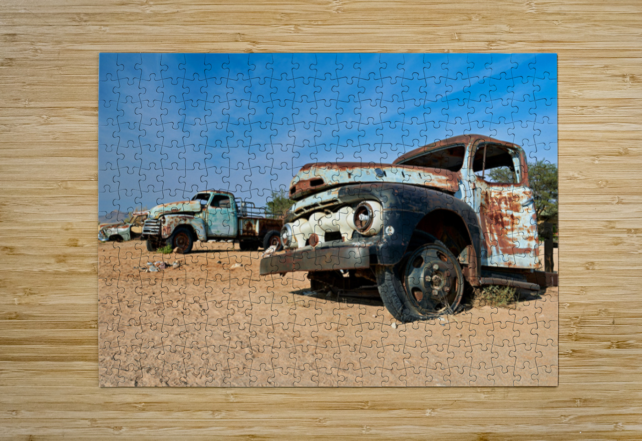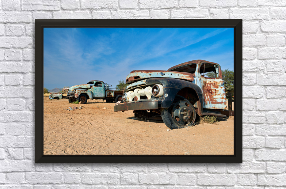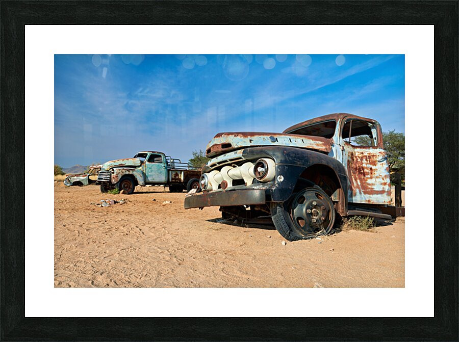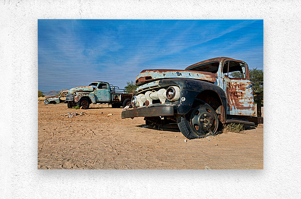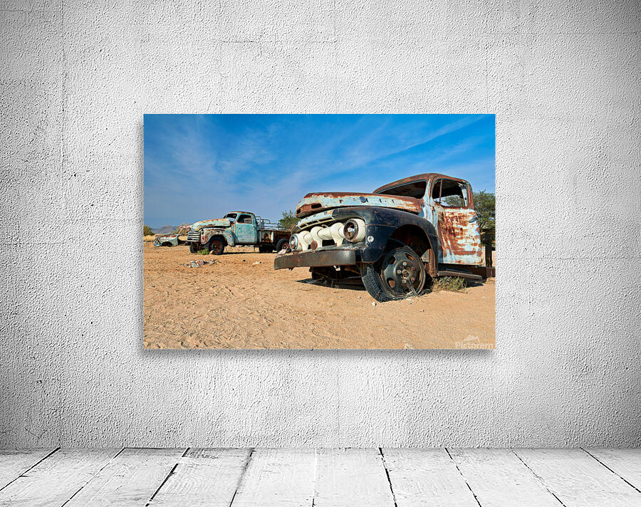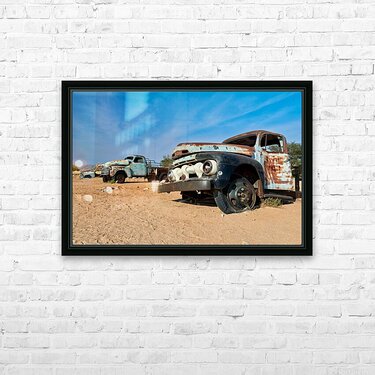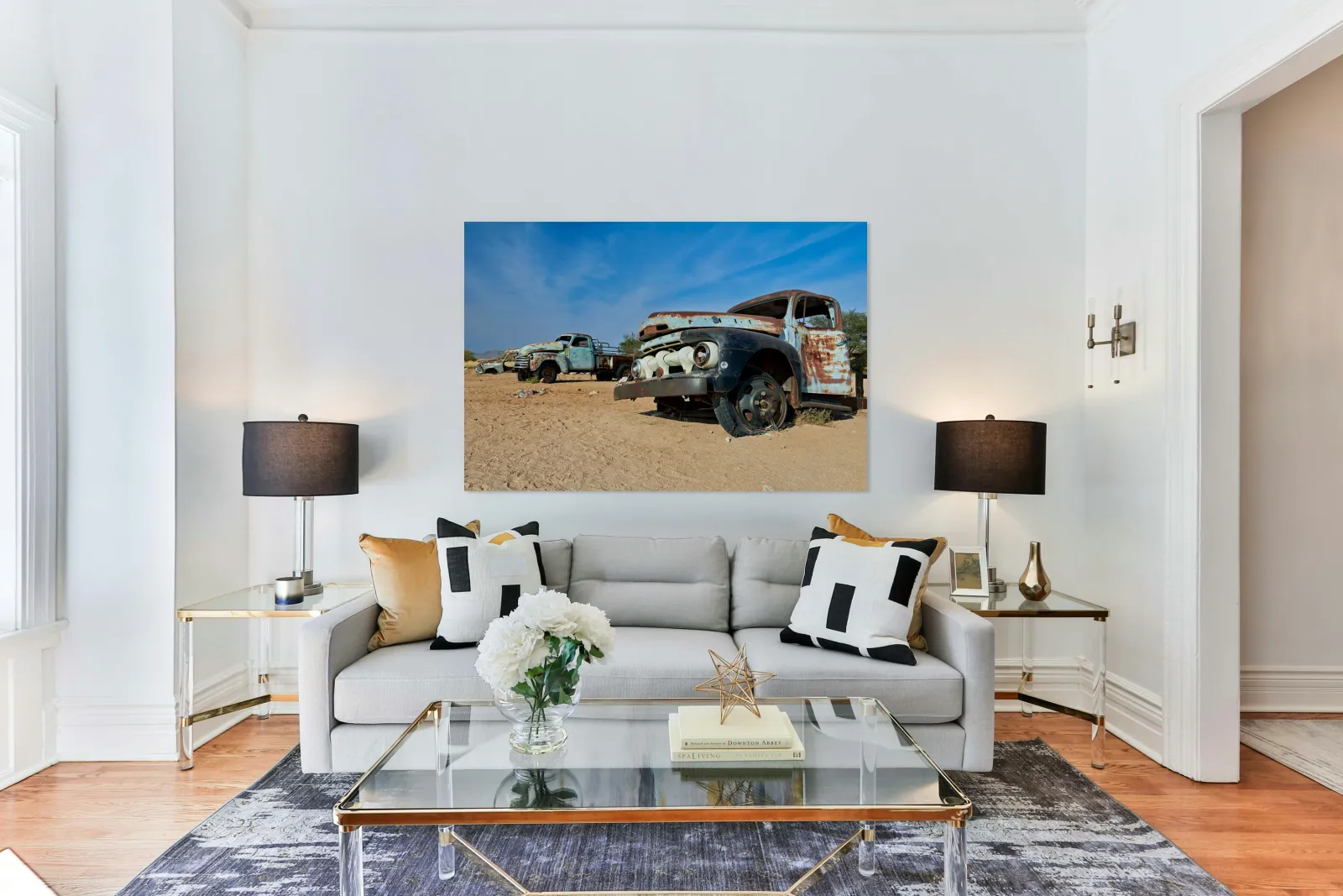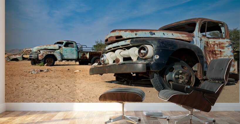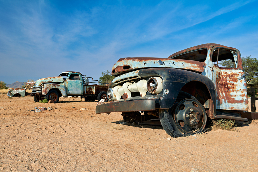 Classic cars sit abandoned in the desert of Namibia showing signs of rust and decay. Sand surrounds the old vehicles under the clear sky.