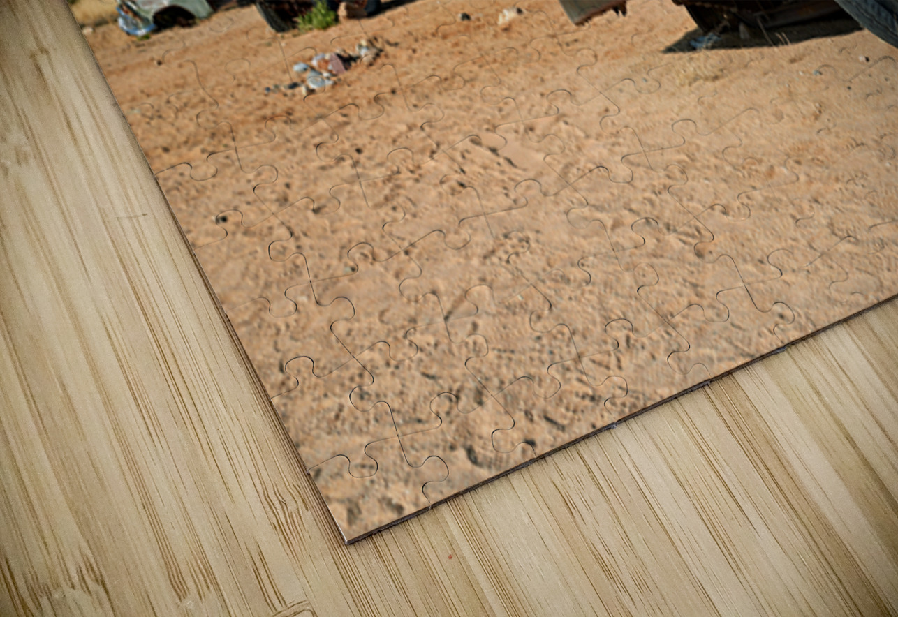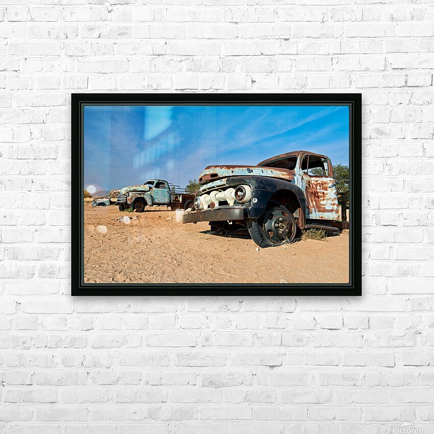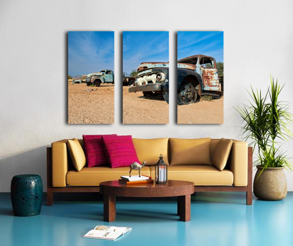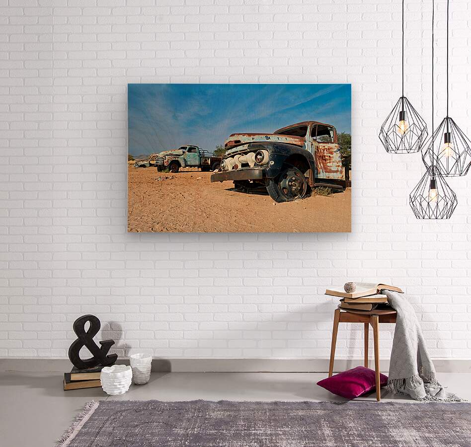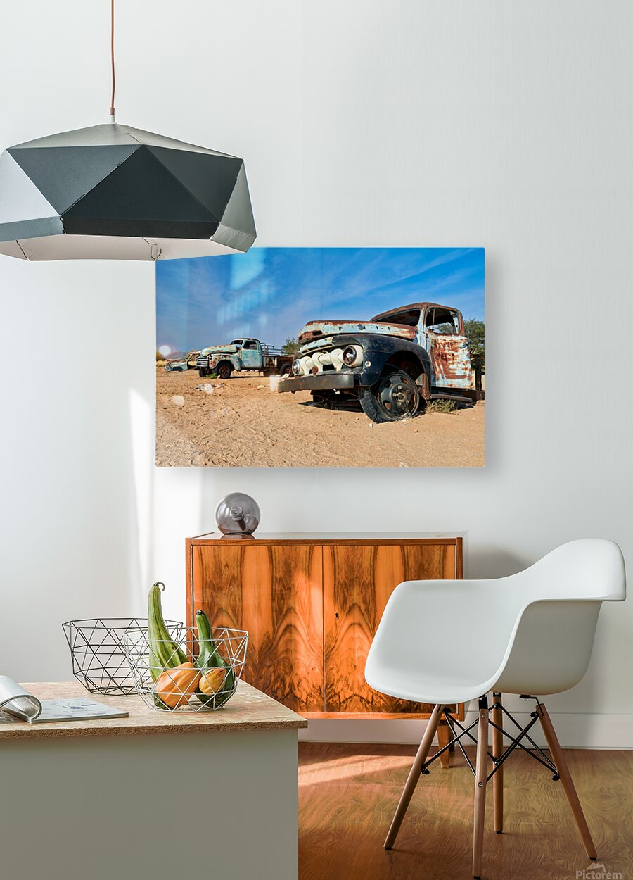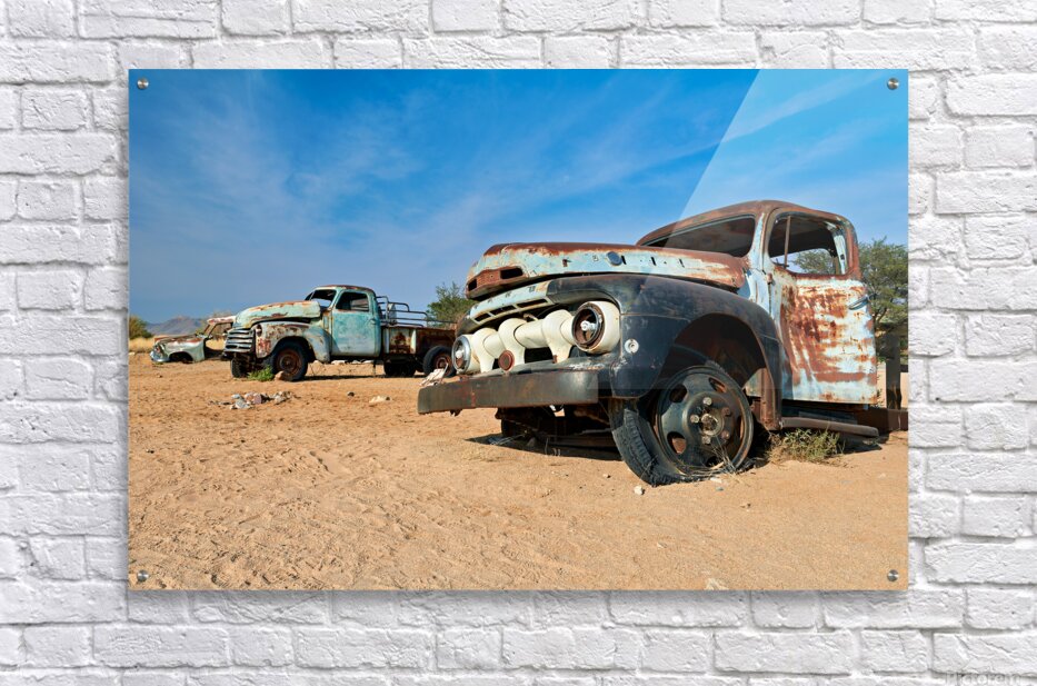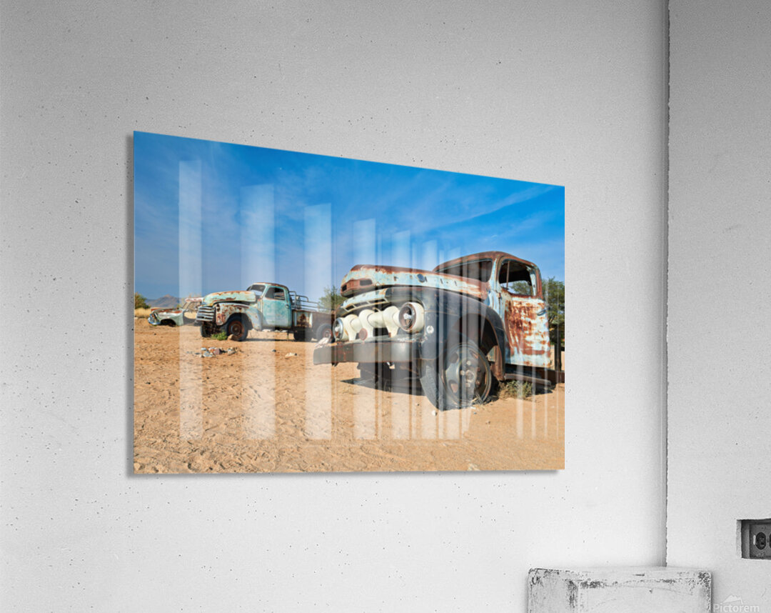 Classic cars sit abandoned in the desert of Namibia showing signs of rust and decay. Sand surrounds the old vehicles under the clear sky.