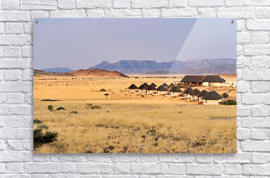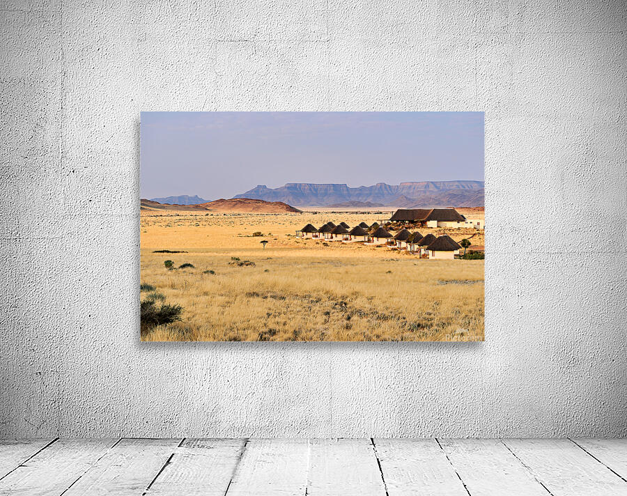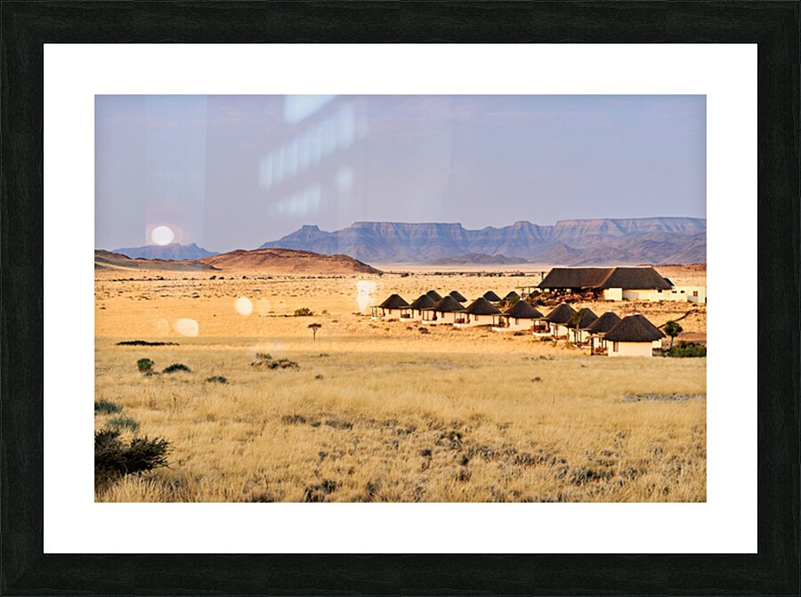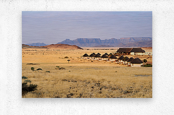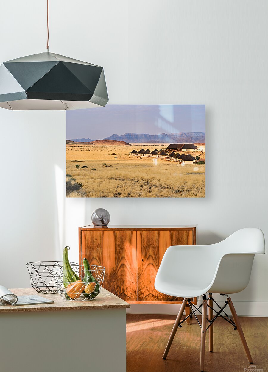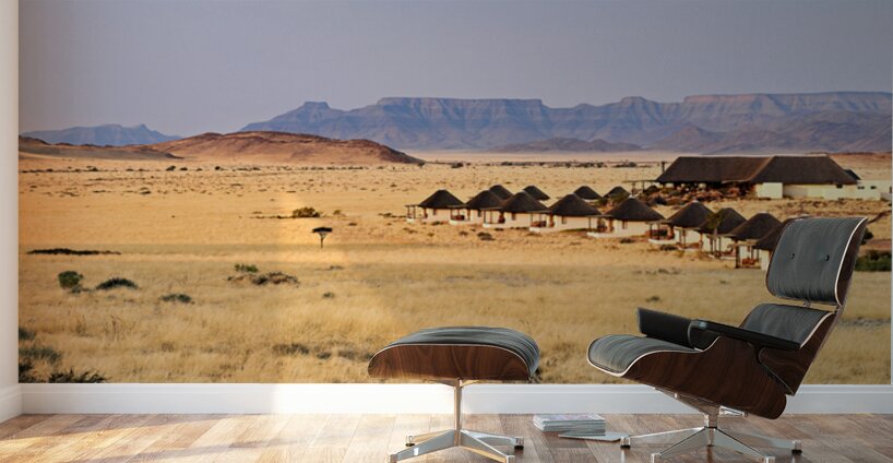 Visitors stay in simple lodges in Namib Naukluft National Park surrounded by desert and mountains in the evening light of Namibia.