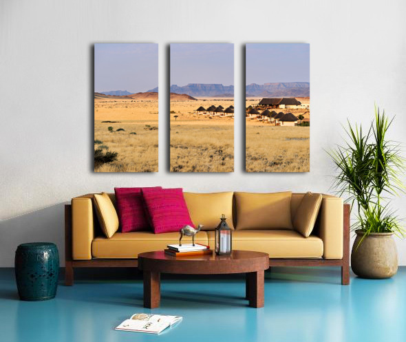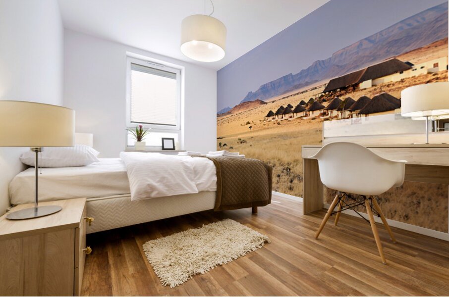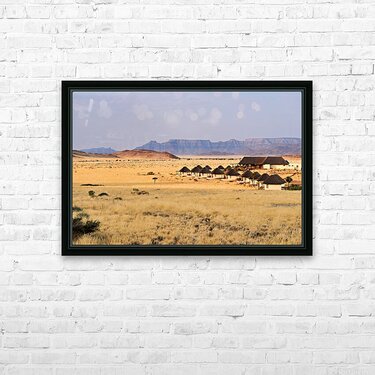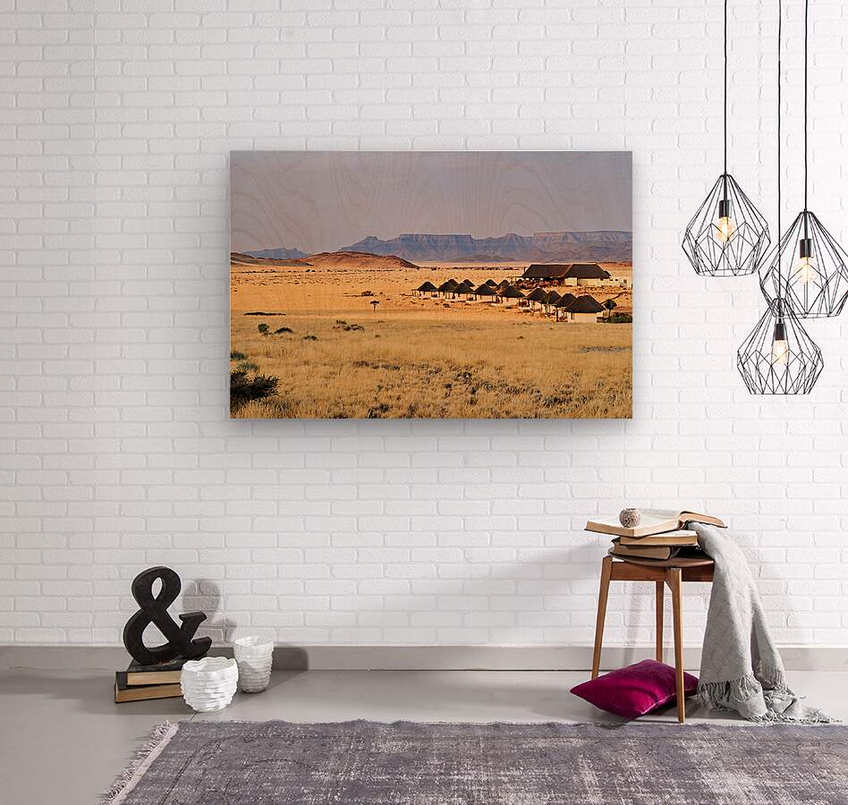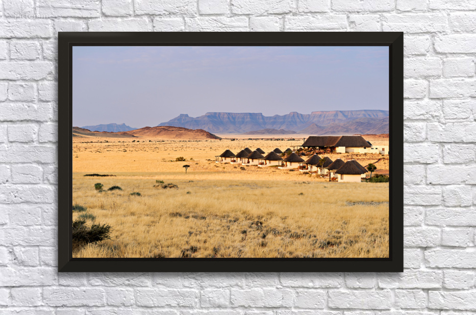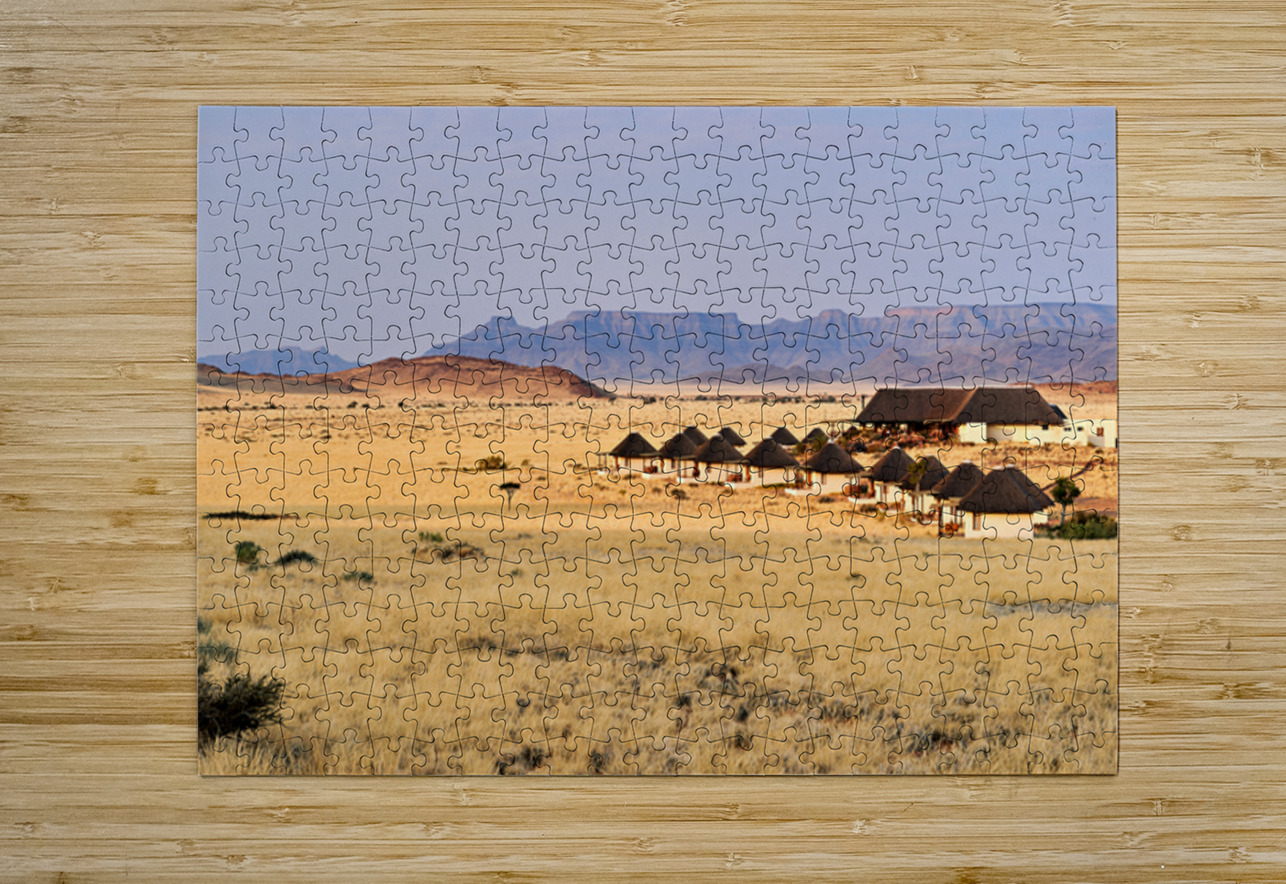Visitors stay in simple lodges in Namib Naukluft National Park surrounded by desert and mountains in the evening light of Namibia.