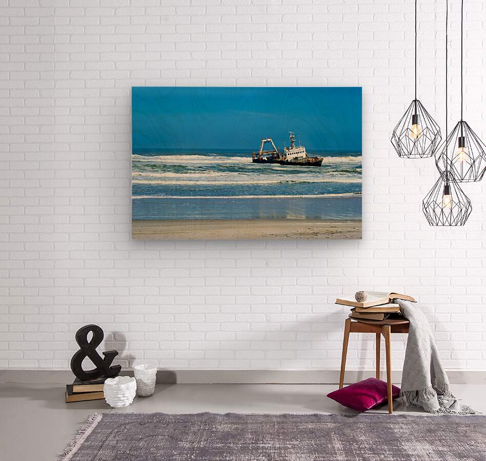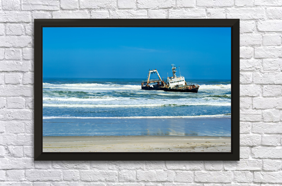 A shipwreck sits stranded on the Skeleton Coast of Namibia. Waves crash around the vessel showing the harsh conditions of the Atlantic Ocean.