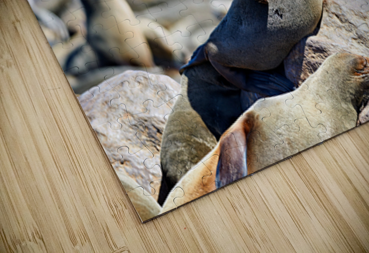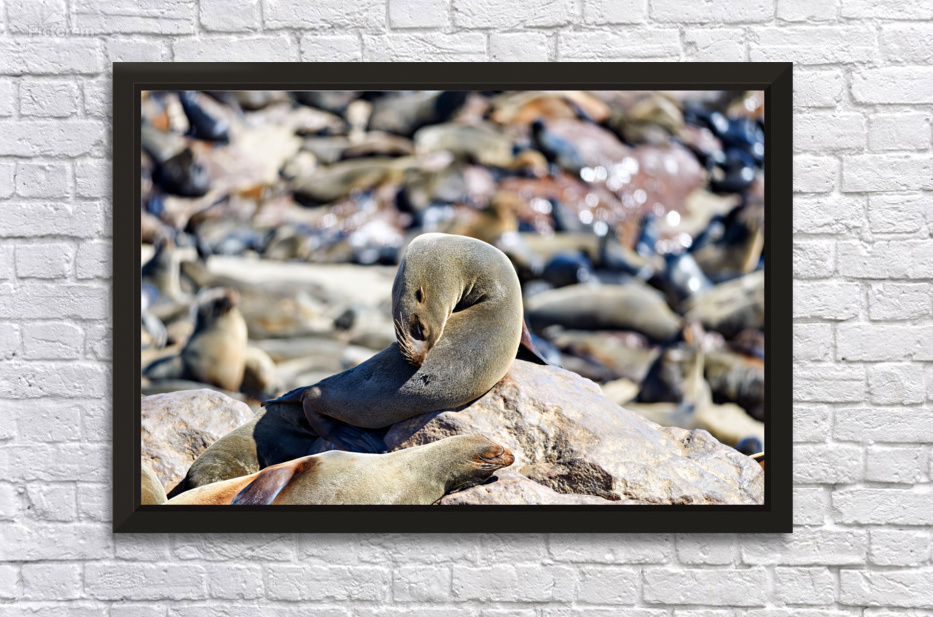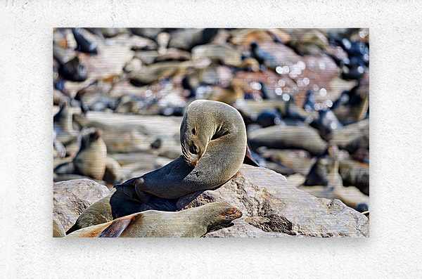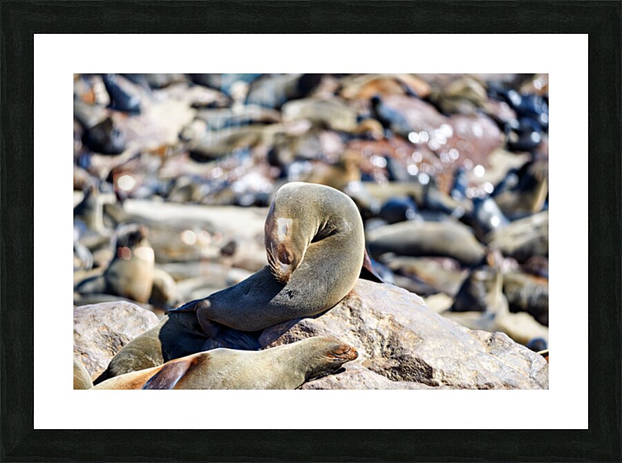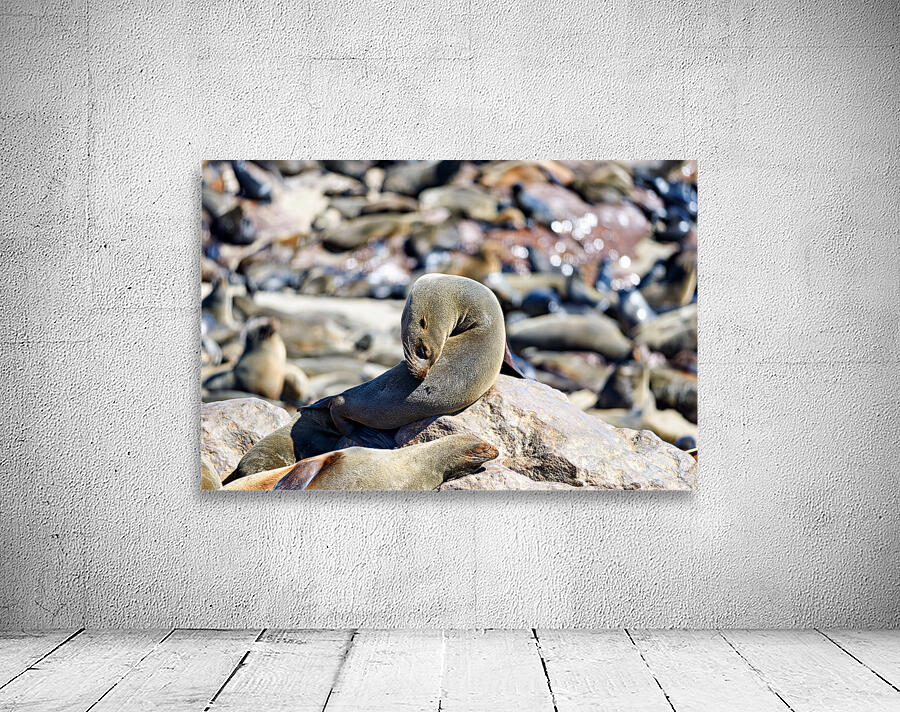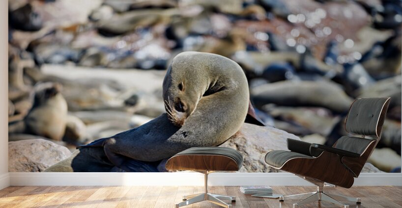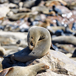 Cape fur seals gather on rocky shorelines at Cape Cross in Namibia. The colony is active with seals lounging and interacting with each other.
