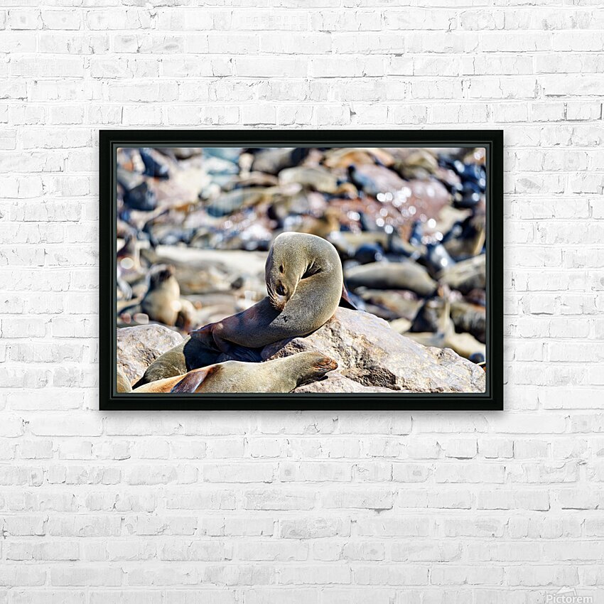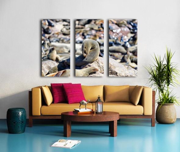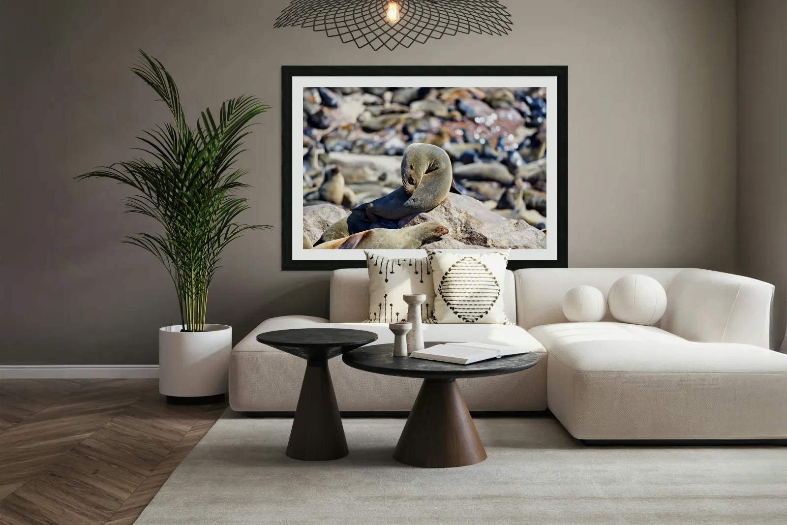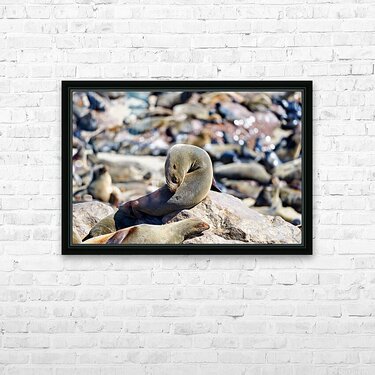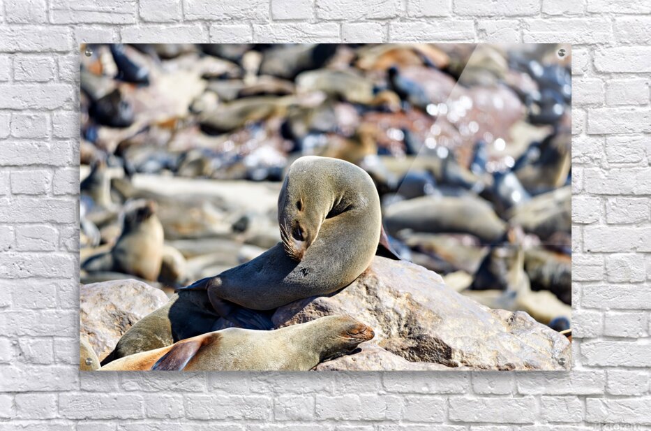 Cape fur seals gather on rocky shorelines at Cape Cross in Namibia. The colony is active with seals lounging and interacting with each other.