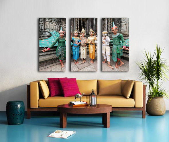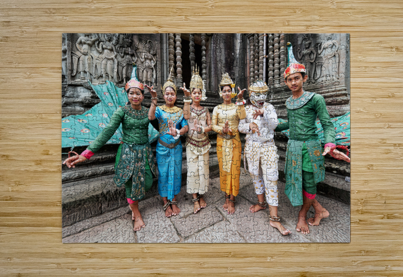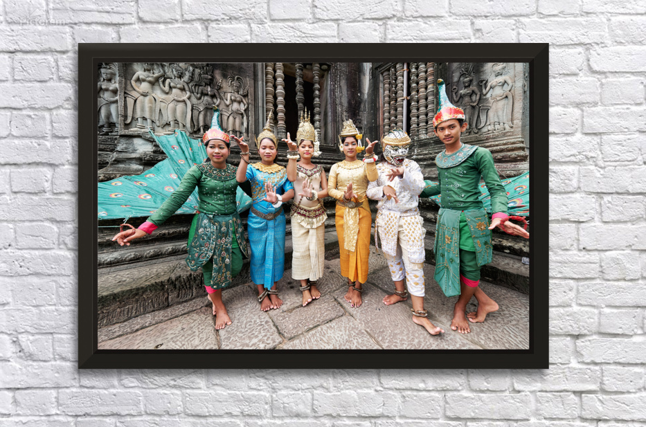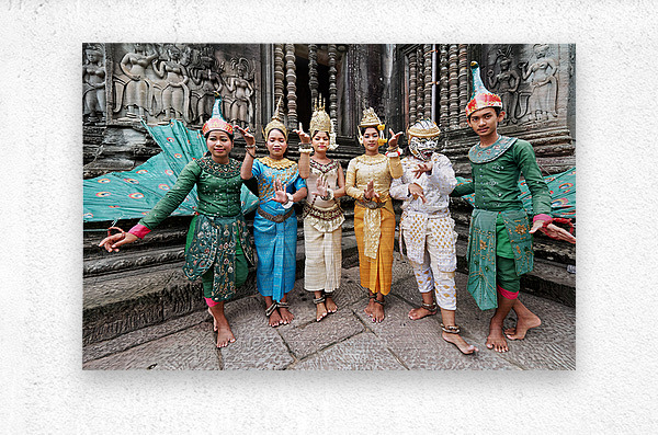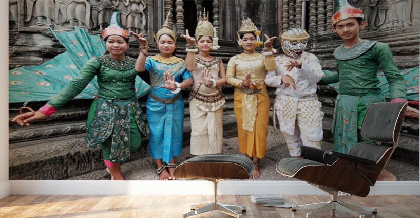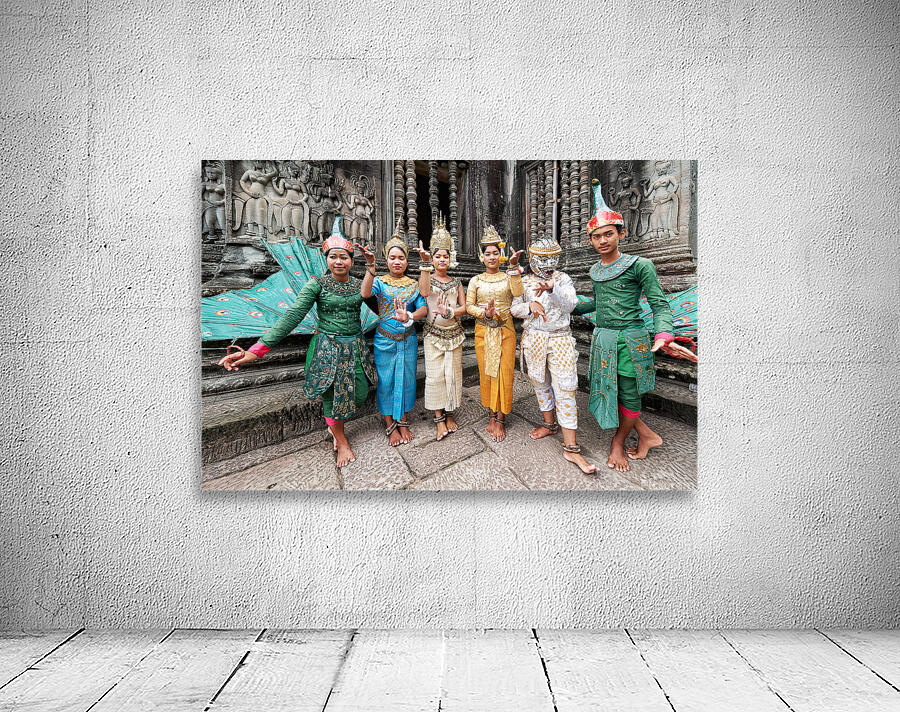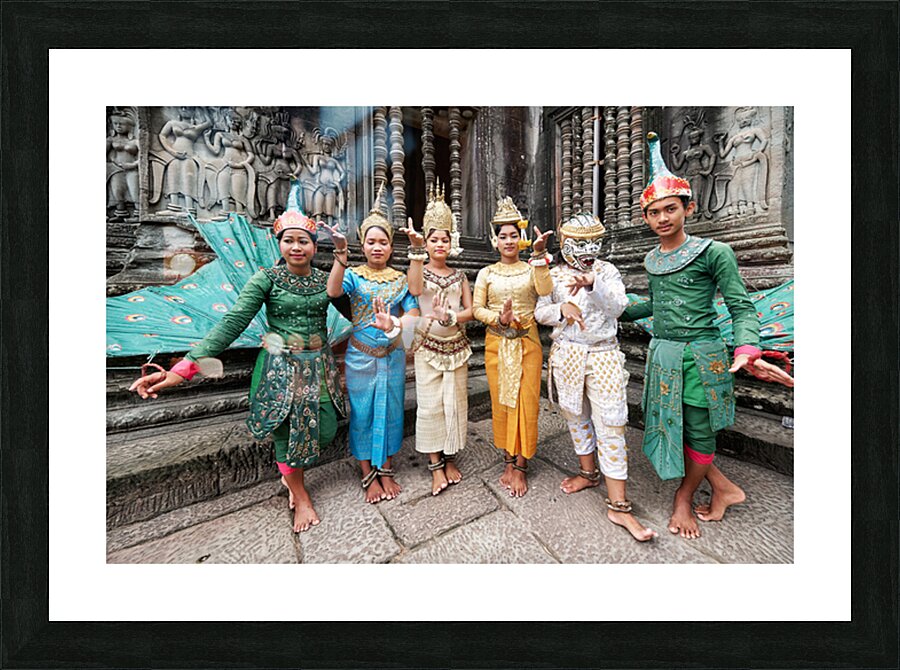 Cambodian dancers in traditional Apsara and Hanuman costumes pose at Angkor Wat Siem Reap Cambodia showcasing their cultural heritage.