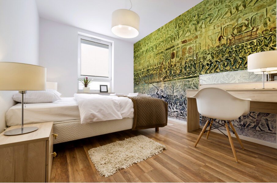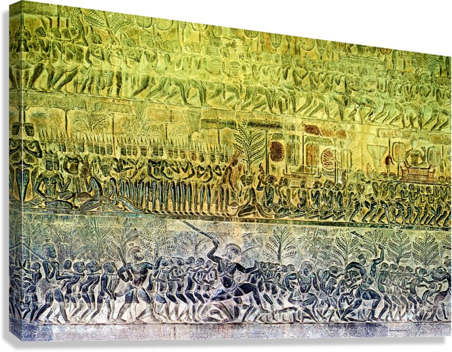 Khmer bas-reliefs at Angkor Wat Cambodia show processions ceremonies and battles. These carvings depict ancient life religious devotion and epic tales.