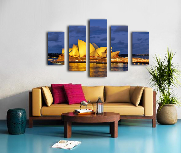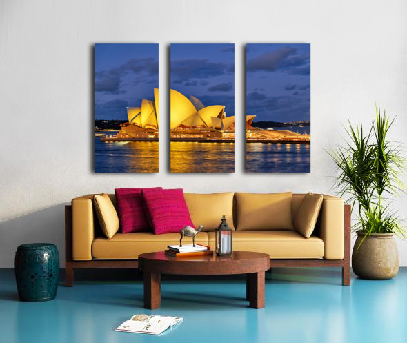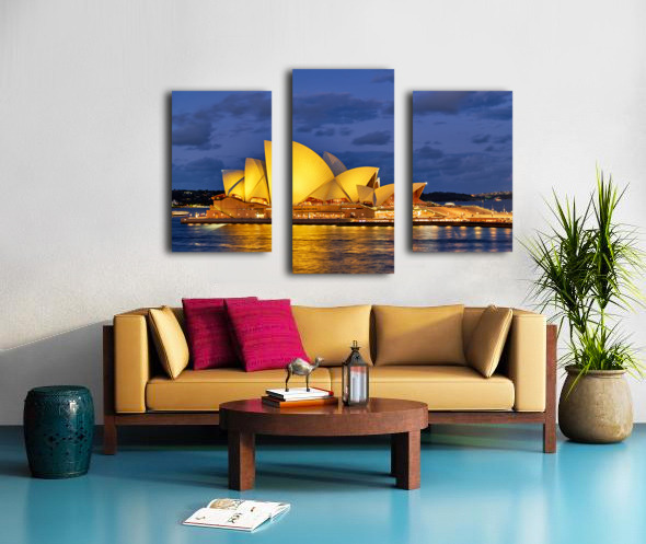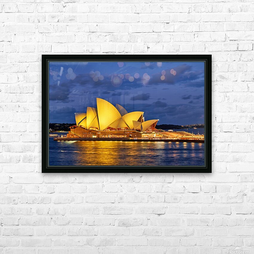 Sydney Opera House illuminated at dusk with harbor lights. Frame print