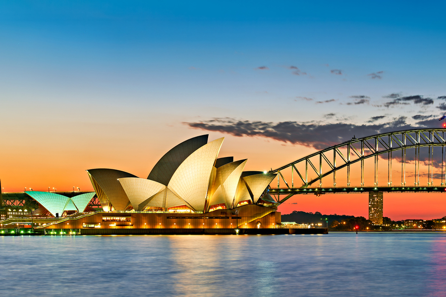 SYDNEY OPERA HOUSE AND HARBOUR BRIDGE AT SUNSET.
