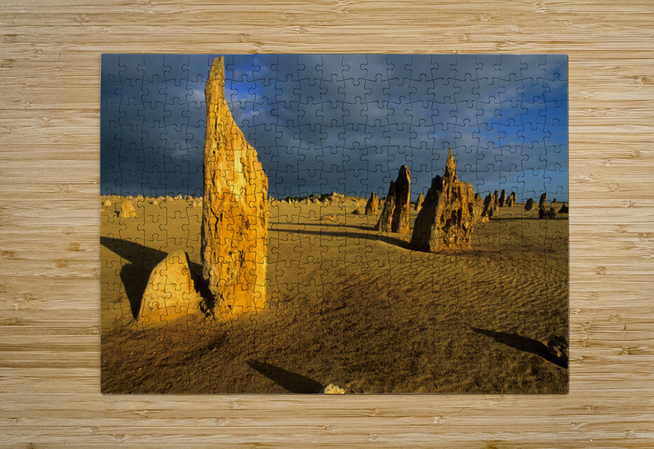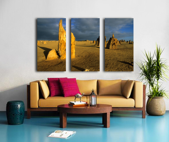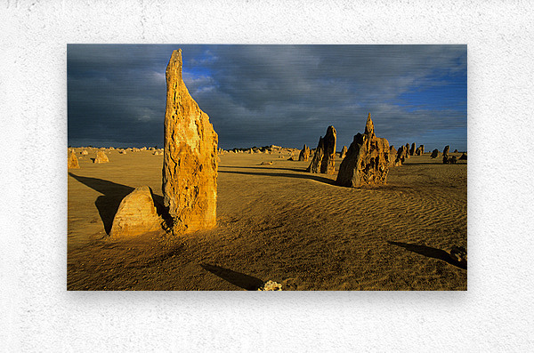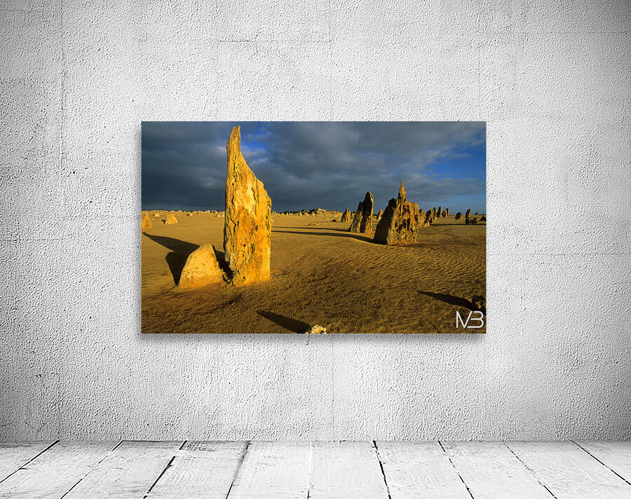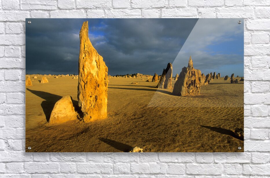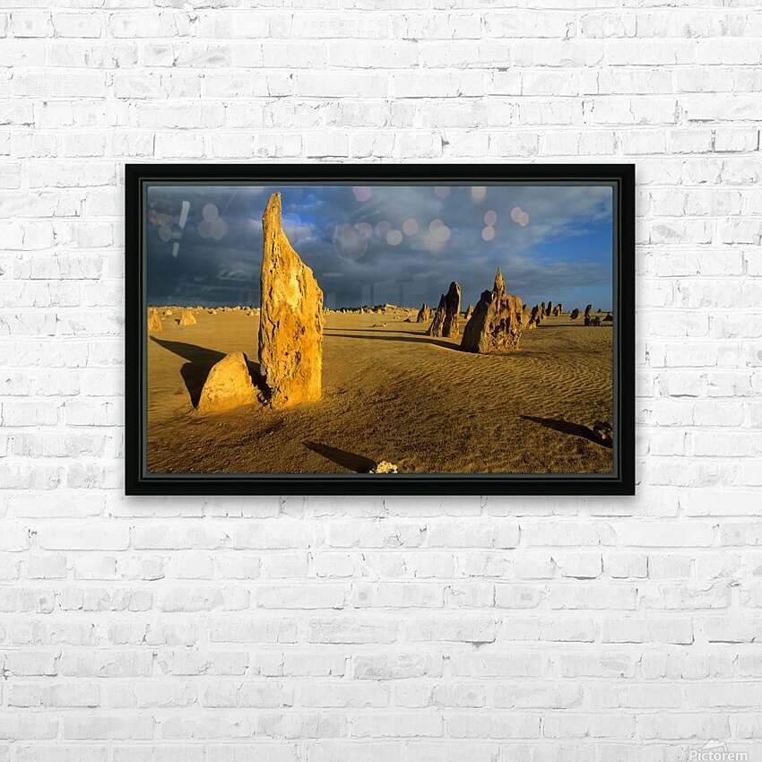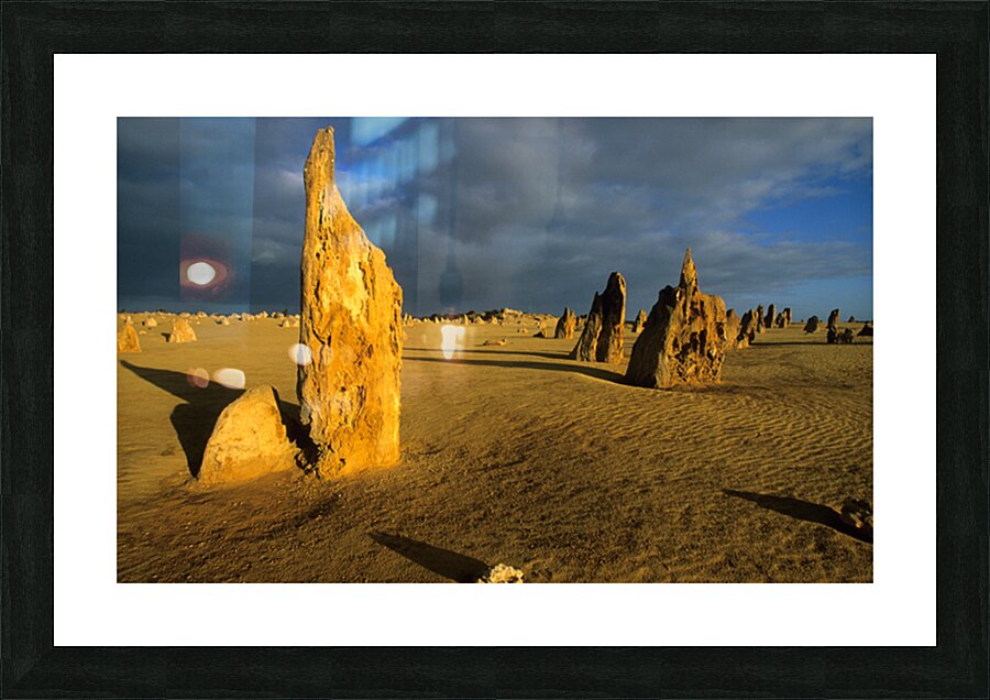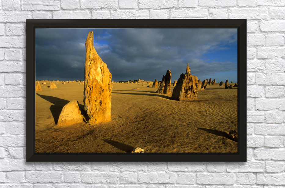 "Pinnacles desert landscape at sunset with dramatic clouds." in a framed print.