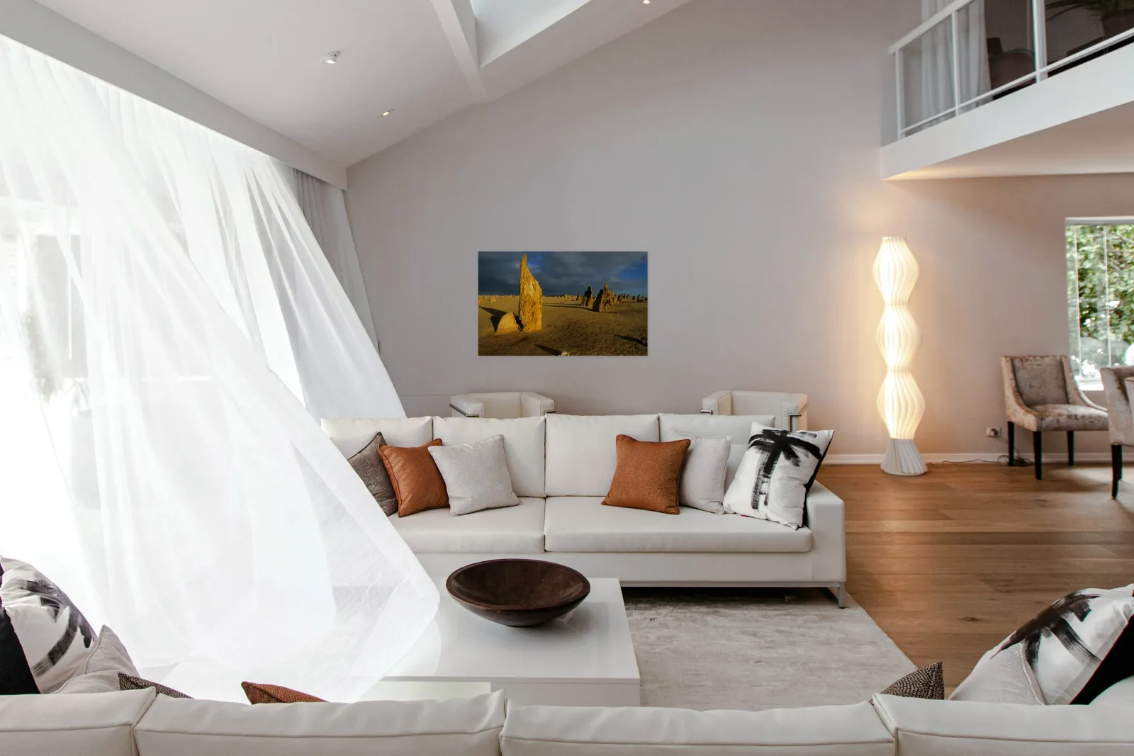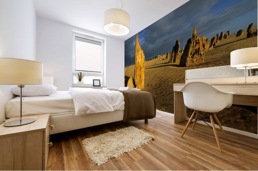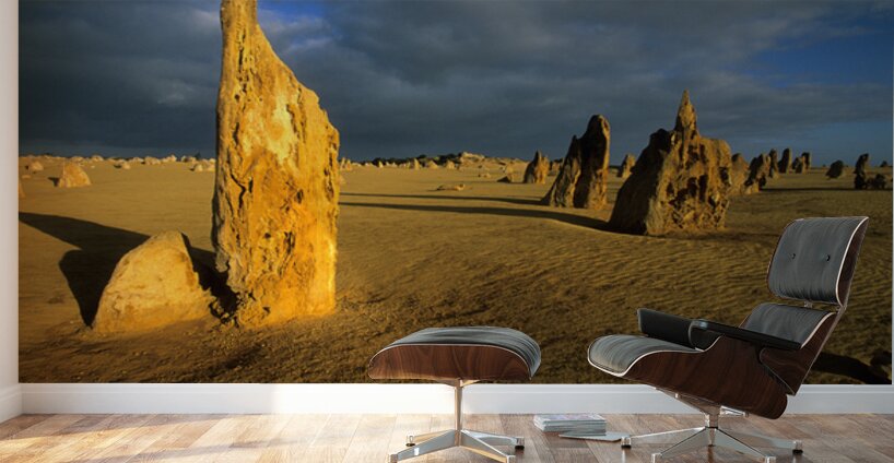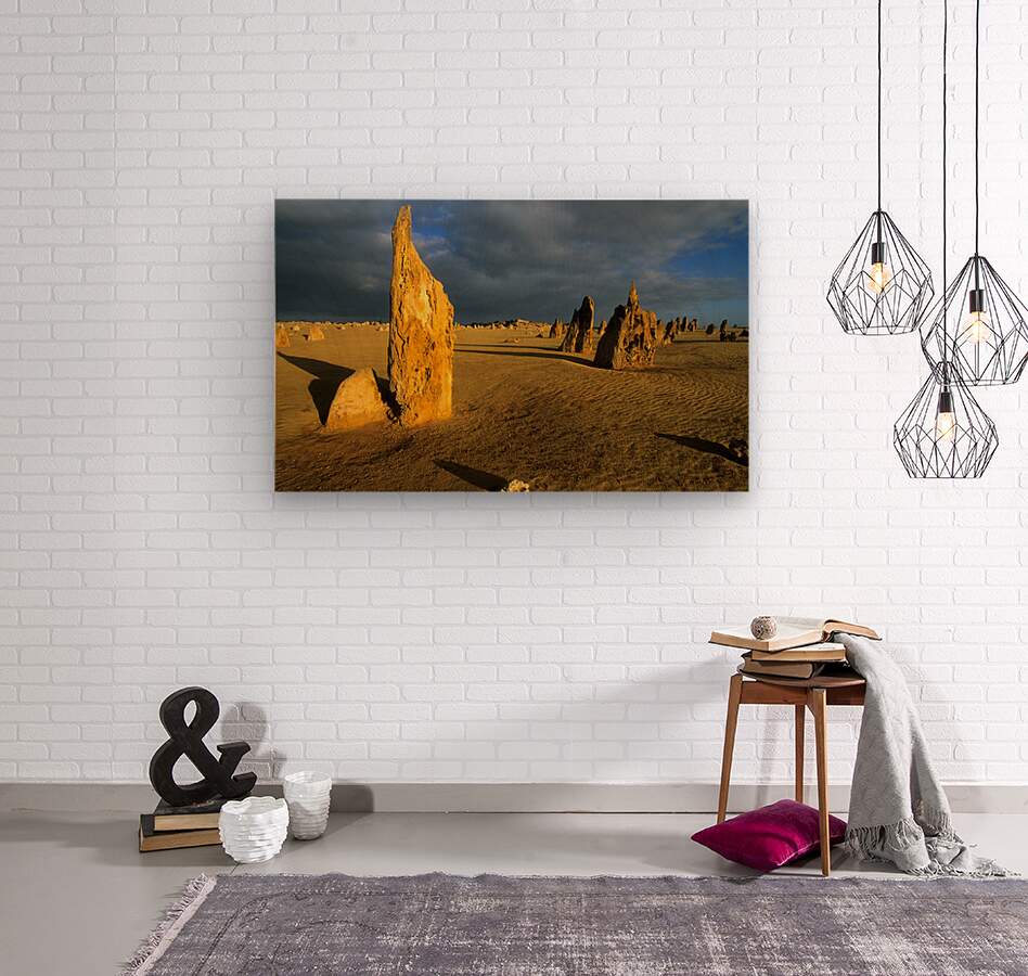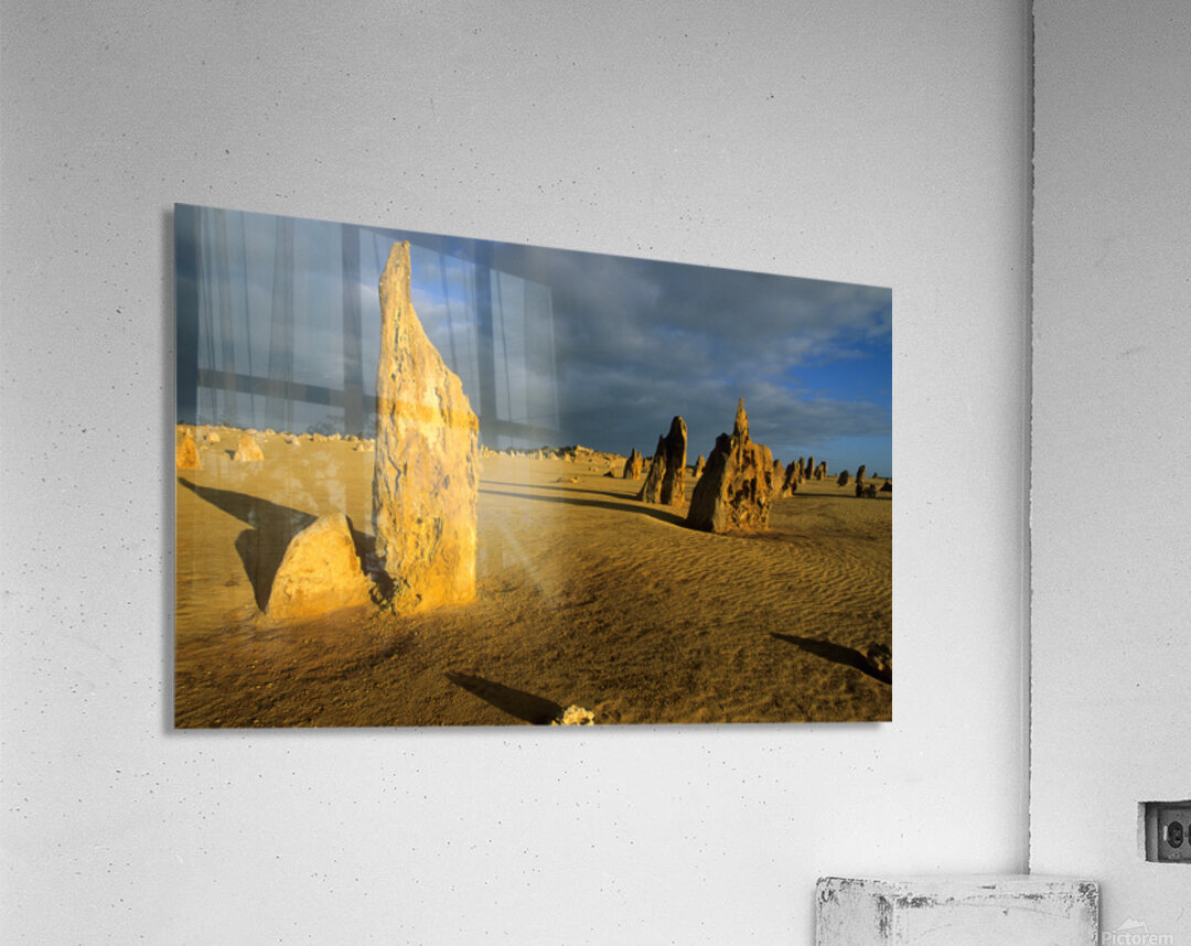 "Pinnacles desert landscape at sunset with dramatic clouds." in a framed print.