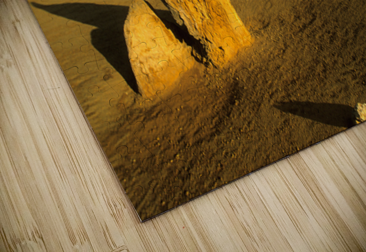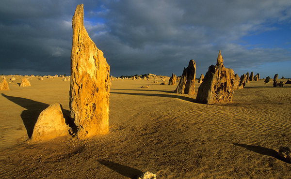 The Pinnacles Desert in Western Australia features limestone formations casting long shadows at sunset creating a dramatic desert landscape.