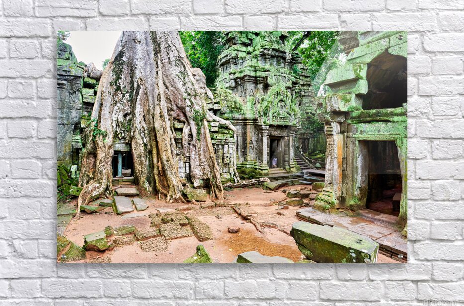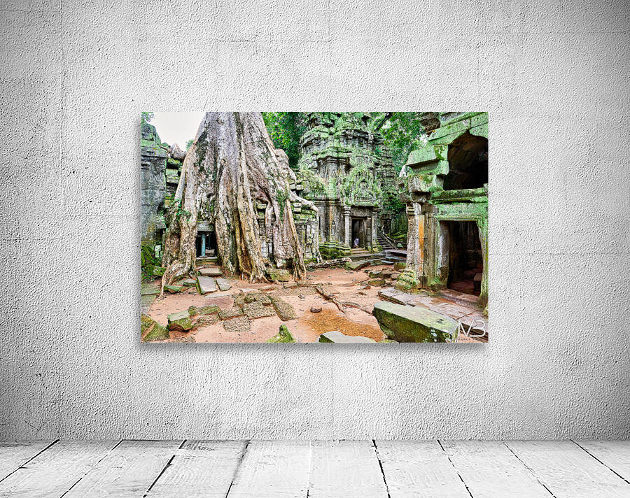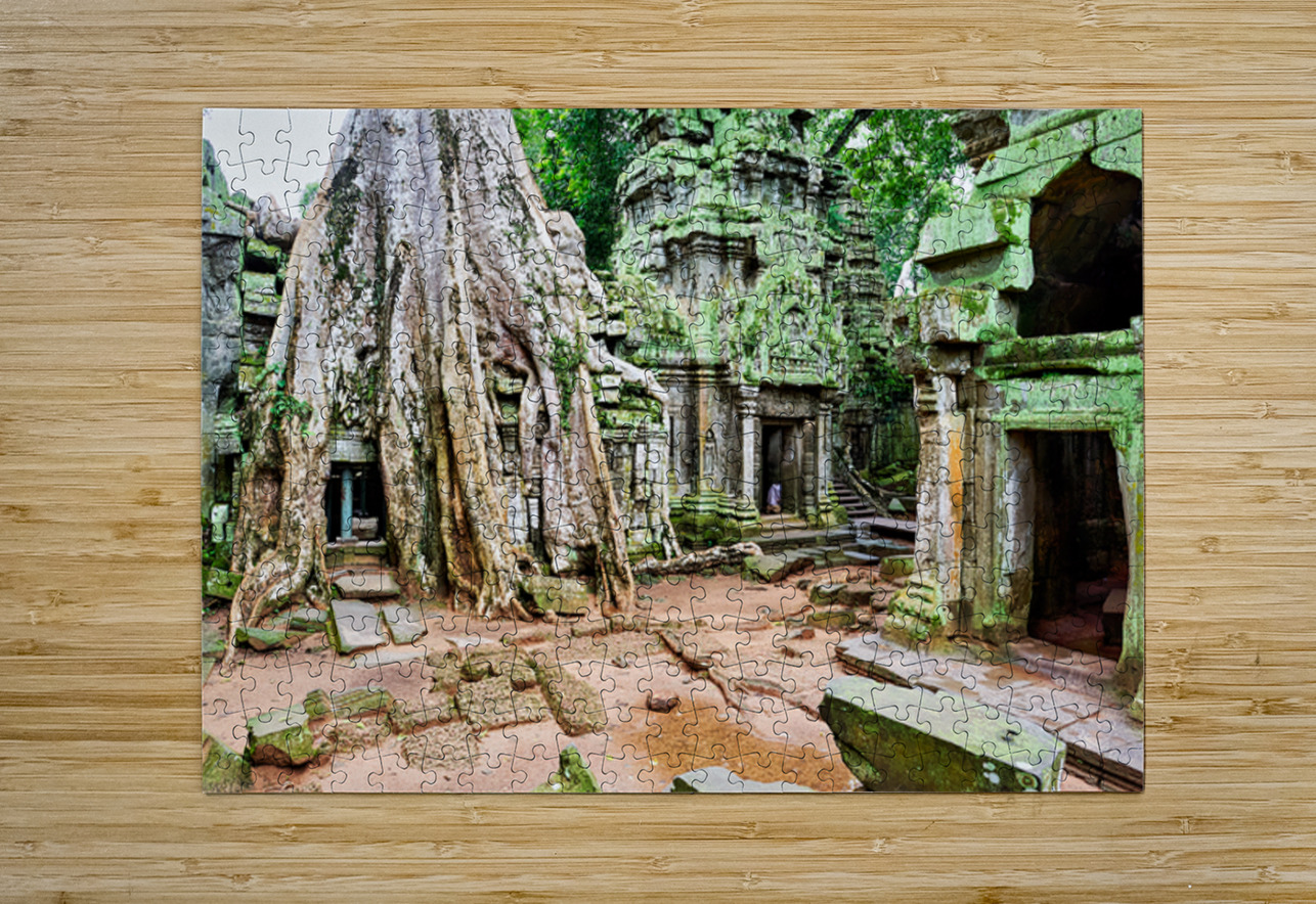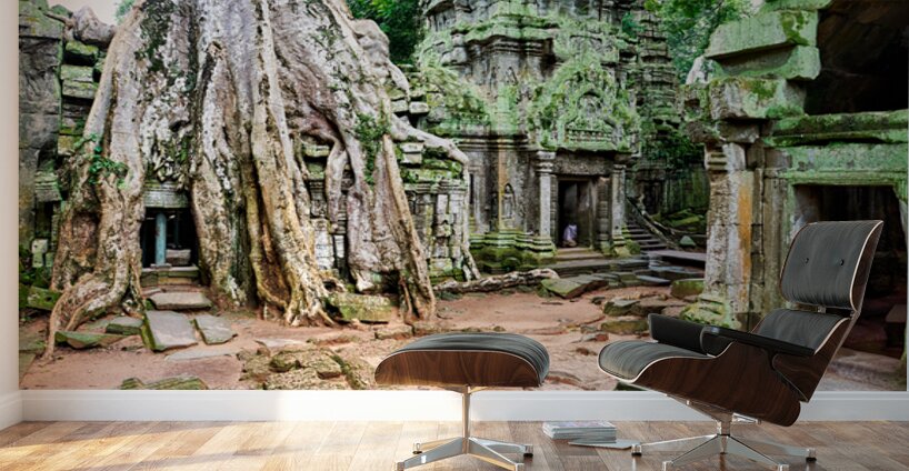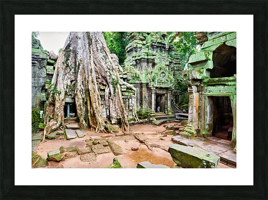 A visitor observes the ancient Ta Prohm temple in Angkor Cambodia where colossal tree roots merge with moss-covered stone showcasing natures reclamati