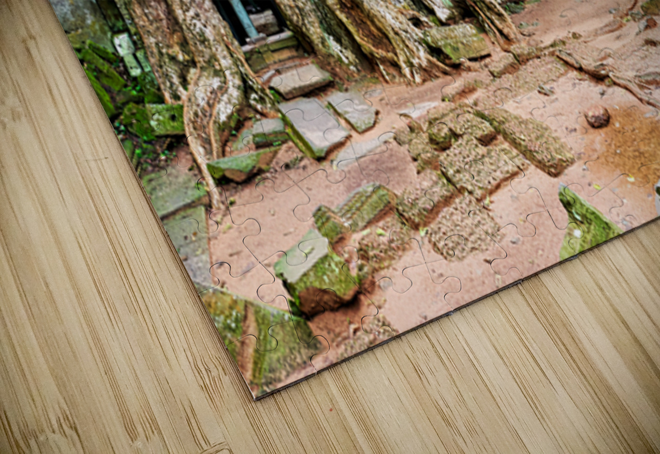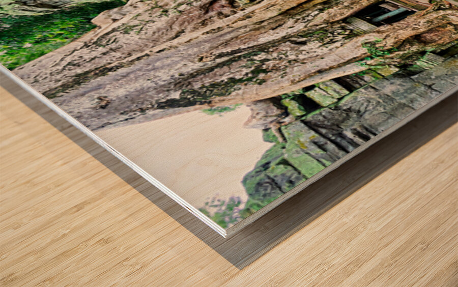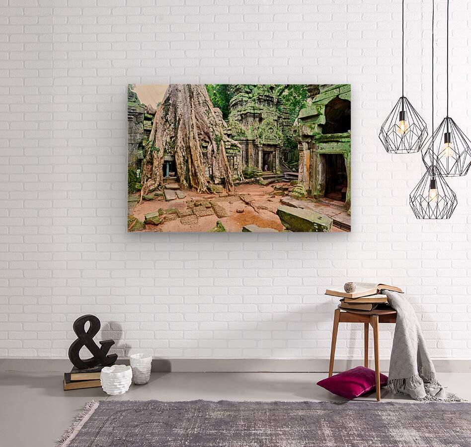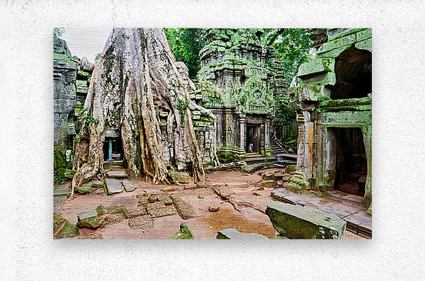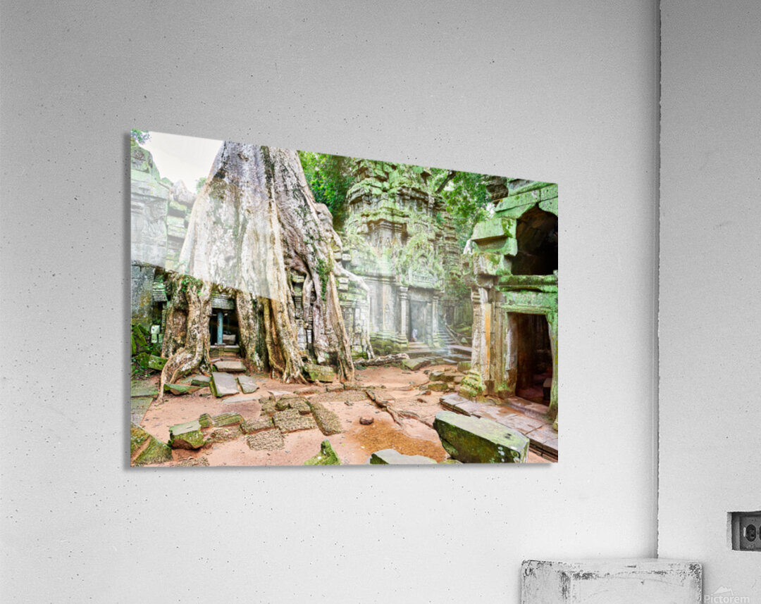 A visitor observes the ancient Ta Prohm temple in Angkor Cambodia where colossal tree roots merge with moss-covered stone showcasing natures reclamati