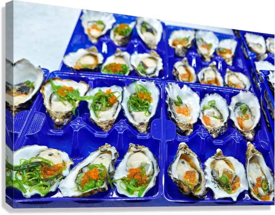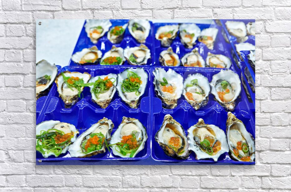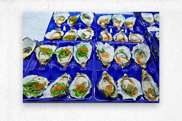 Get this artwork "Fresh oysters with garnishes in blue trays." in a framed print.