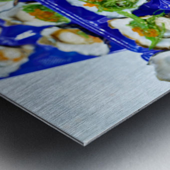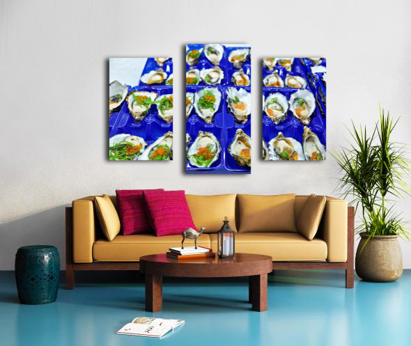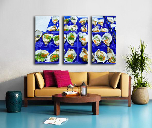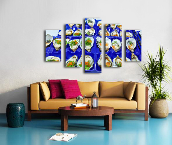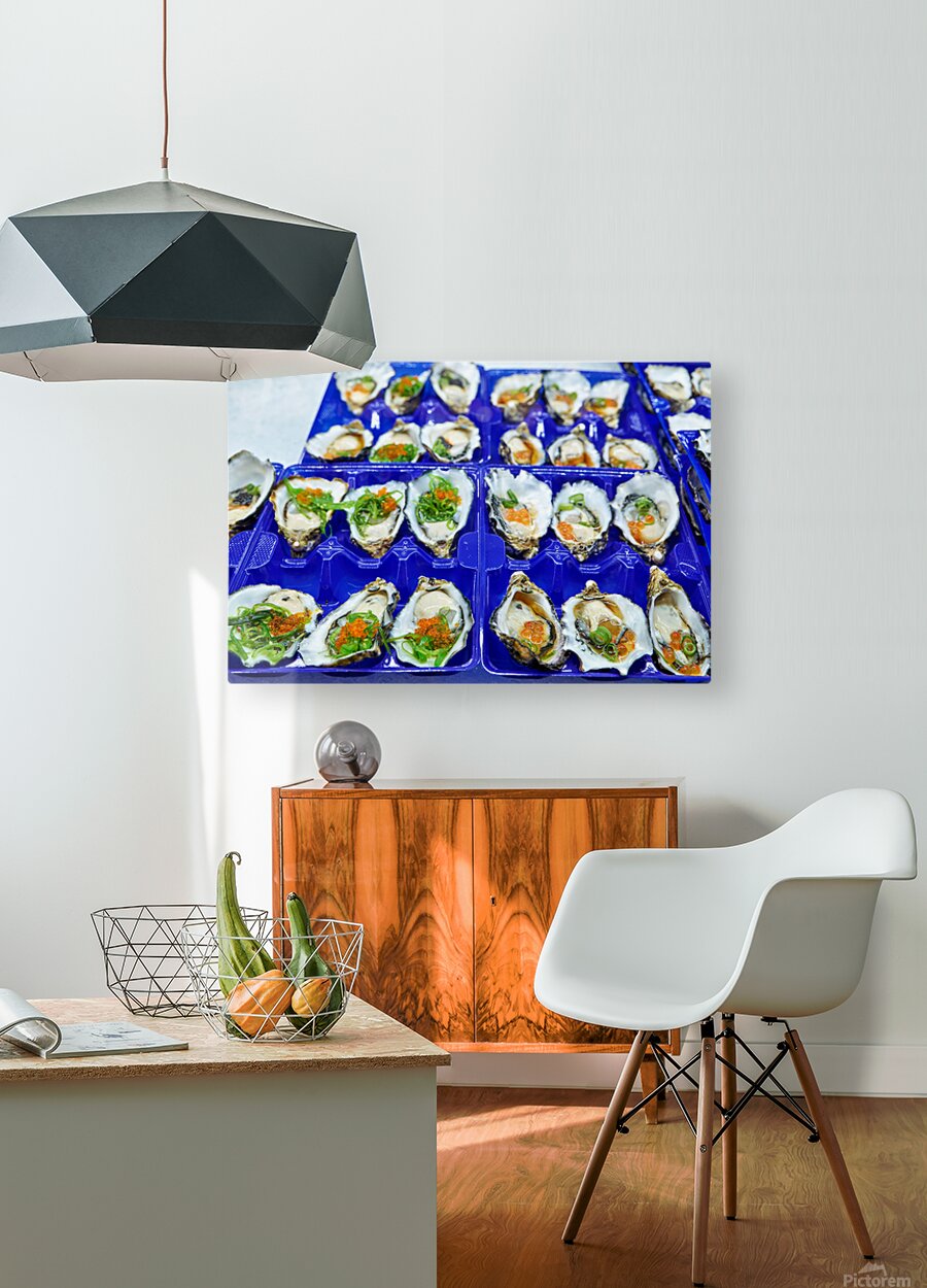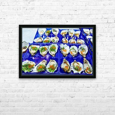 Fresh oysters with garnishes in blue trays. Picture Frame Printing