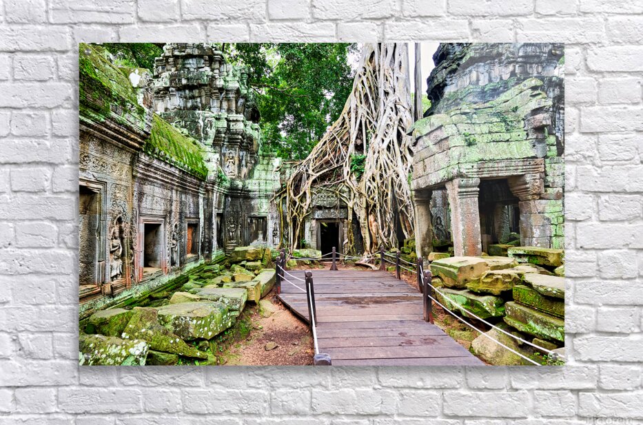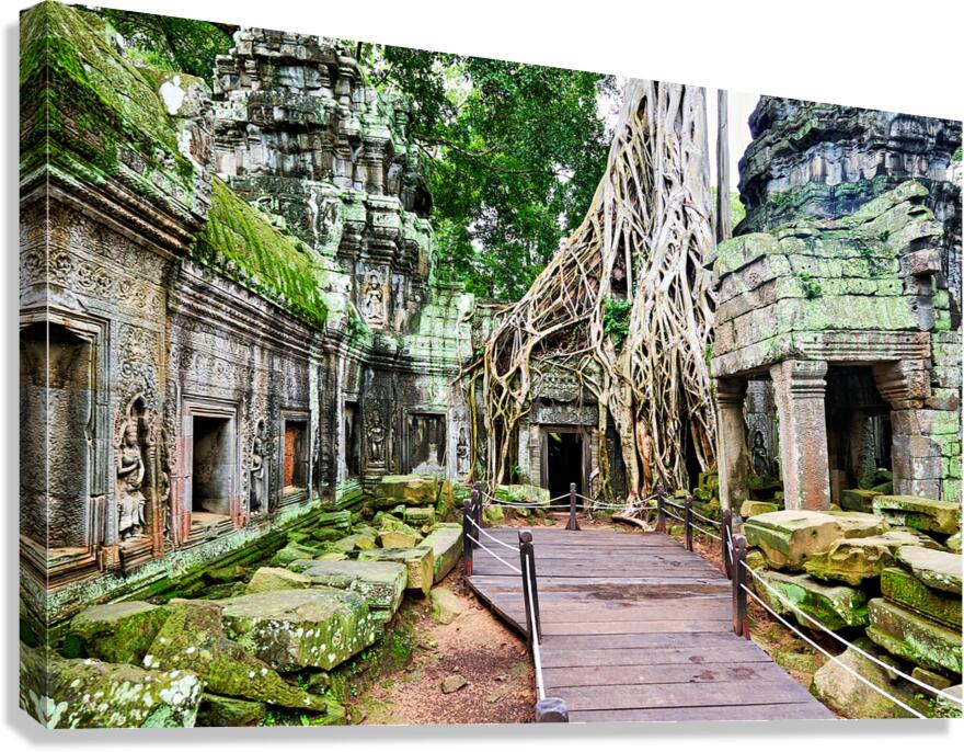 Ta Prohm temple in Angkor Cambodia where ancient stone ruins are embraced by massive tree roots. A walkway guides visitors through this historical sit...[+]