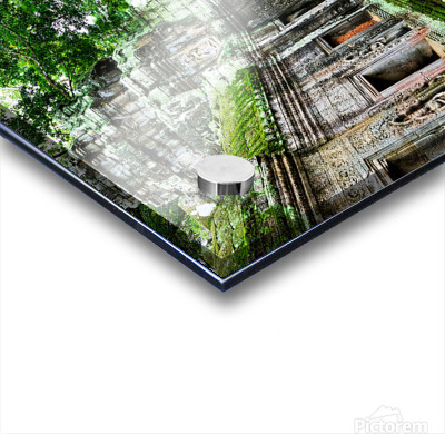 Massive tree roots engulf ancient temple ruins with moss. Picture Frame Printing