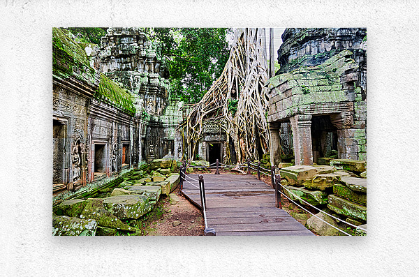 Ta Prohm temple in Angkor Cambodia where ancient stone ruins are embraced by massive tree roots. A walkway guides visitors through this historical site.