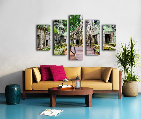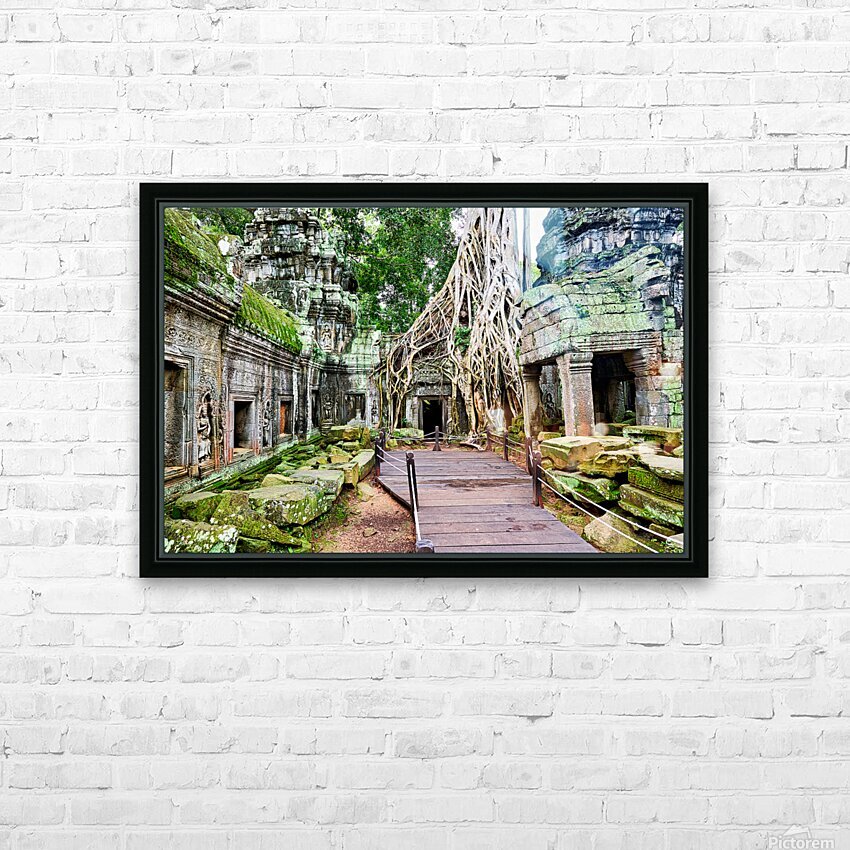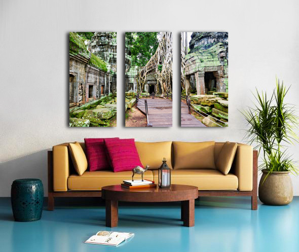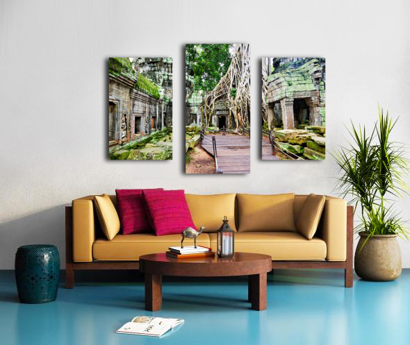 Massive tree roots engulf ancient temple ruins with moss. Frame print