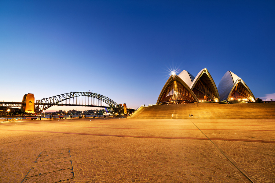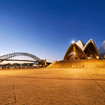 SYDNEY OPERA HOUSE AND HARBOUR BRIDGE AT DUSK.