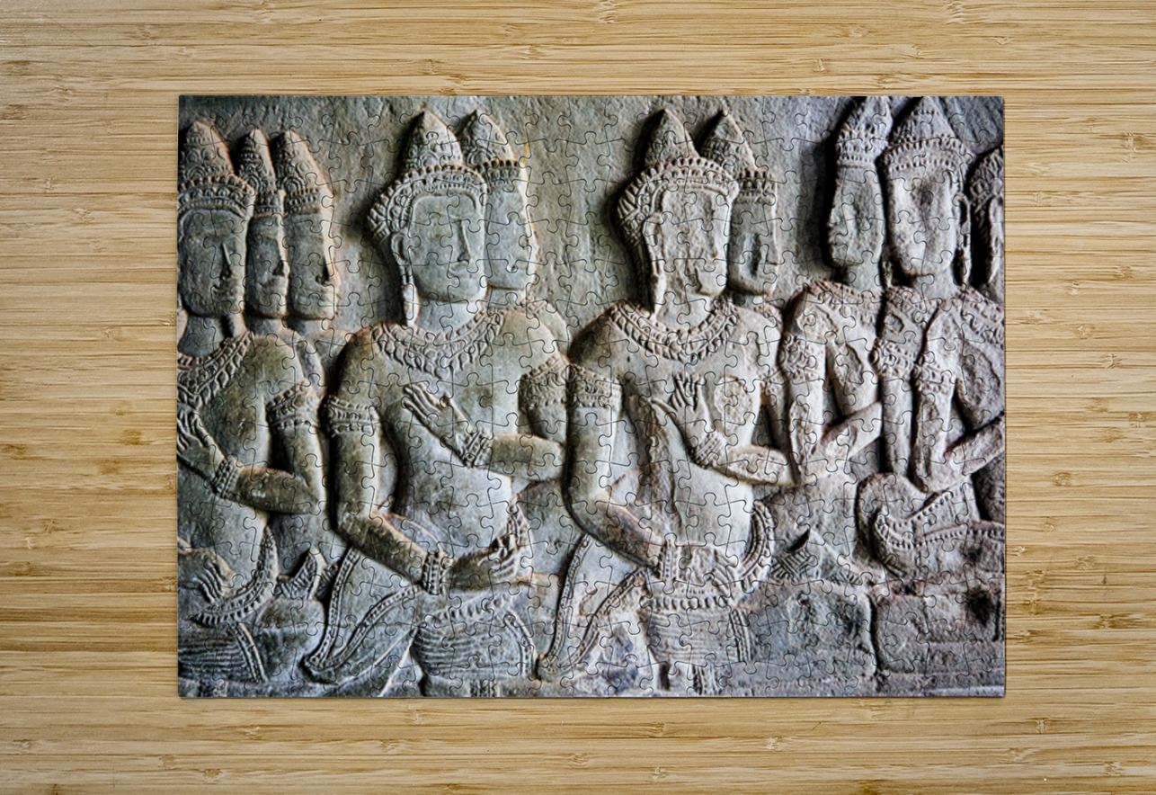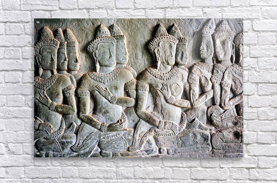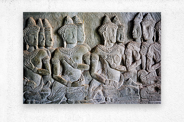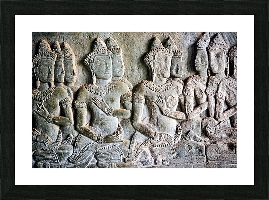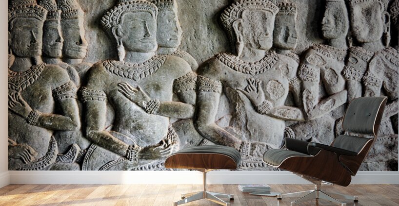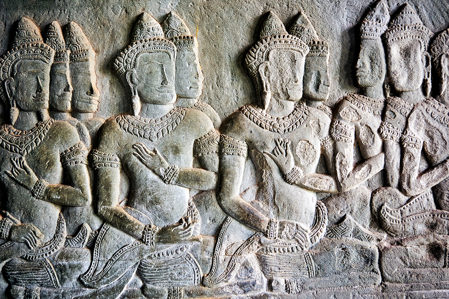 Intricate bas-reliefs of Apsaras celestial dancers adorning the walls of Angkor Wat temple in Siem Reap Cambodia showcasing ancient Khmer art.