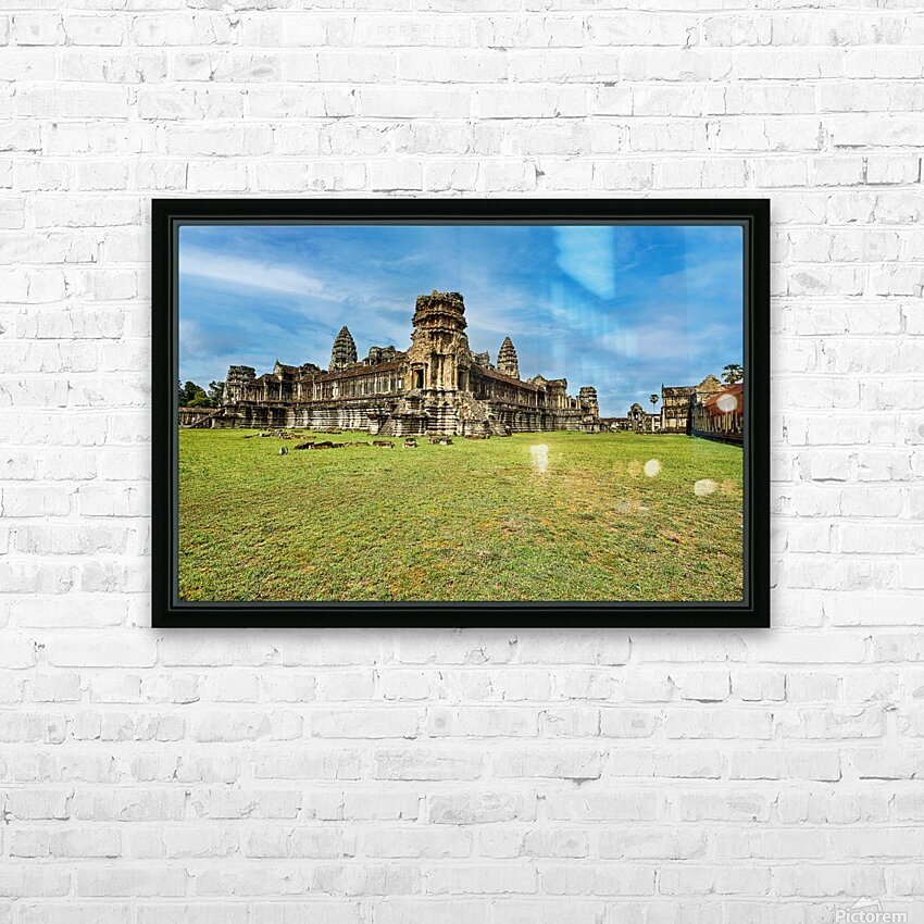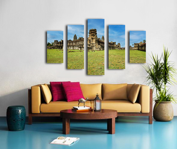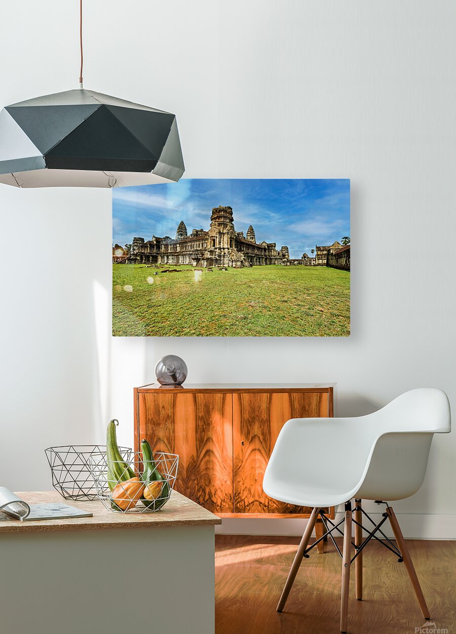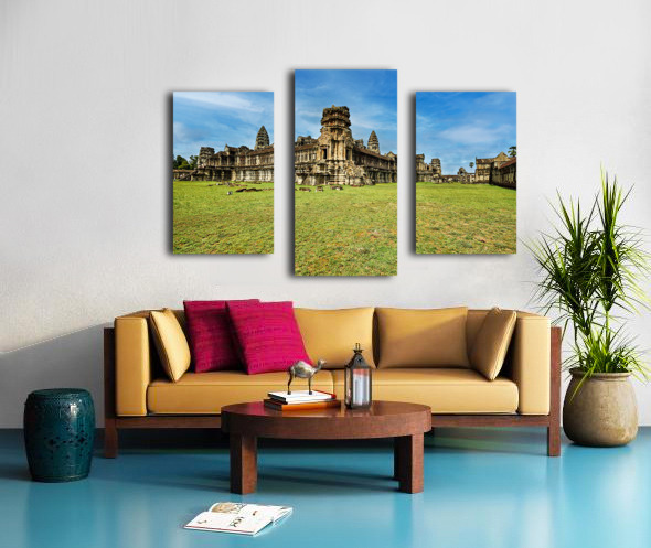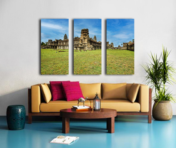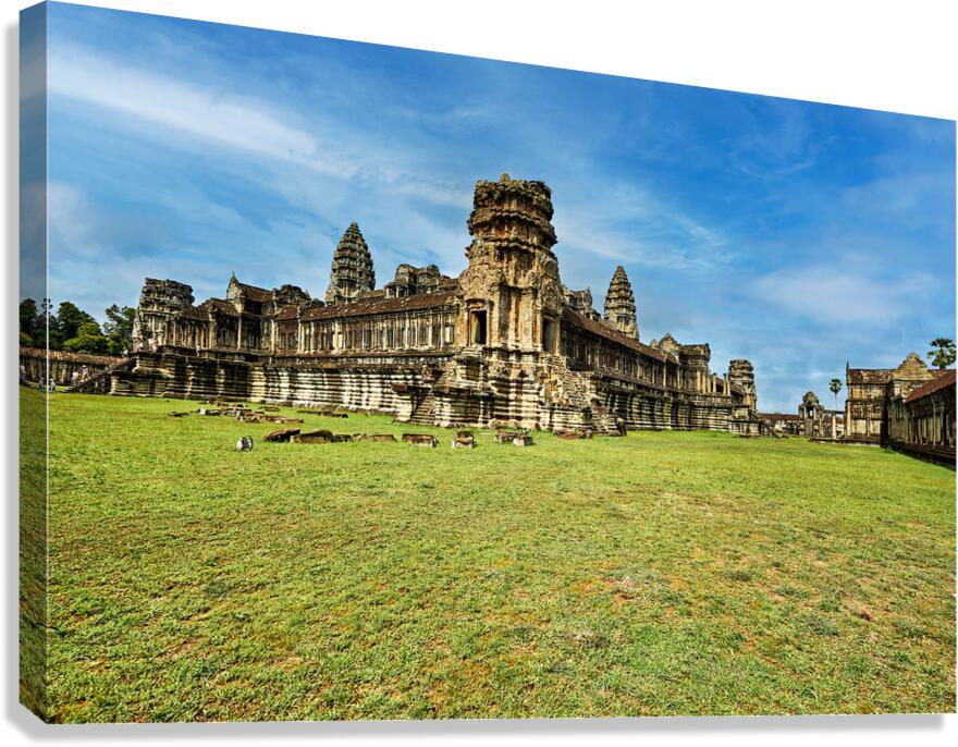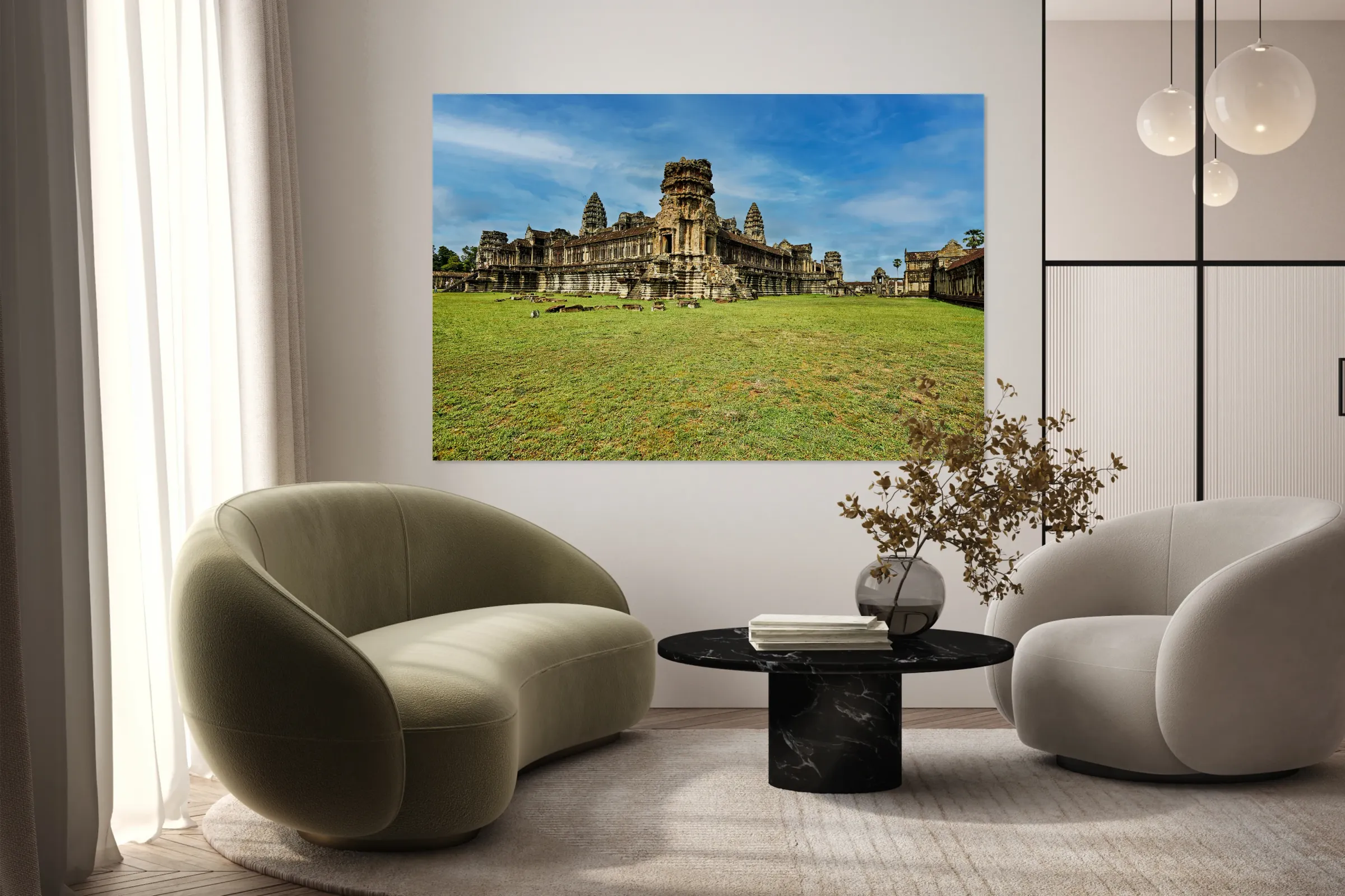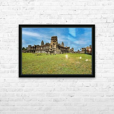 Angkor Wat temple complex with green grass and blue sky. Frame print