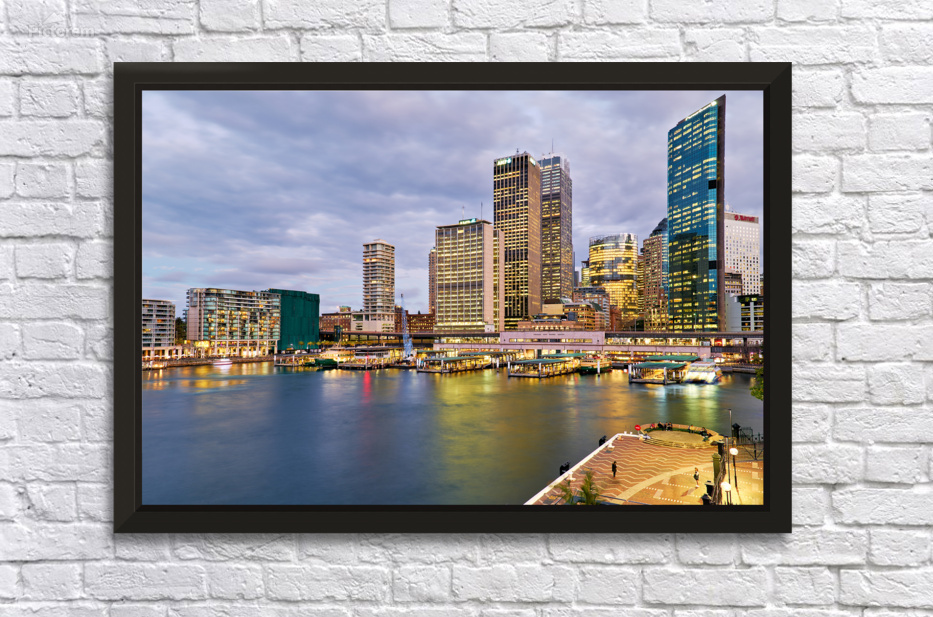 Sydney Australia - December 20 2013: Ferries dock at Circular Quay a bustling transport hub and tourist destination with the city skyline illuminated