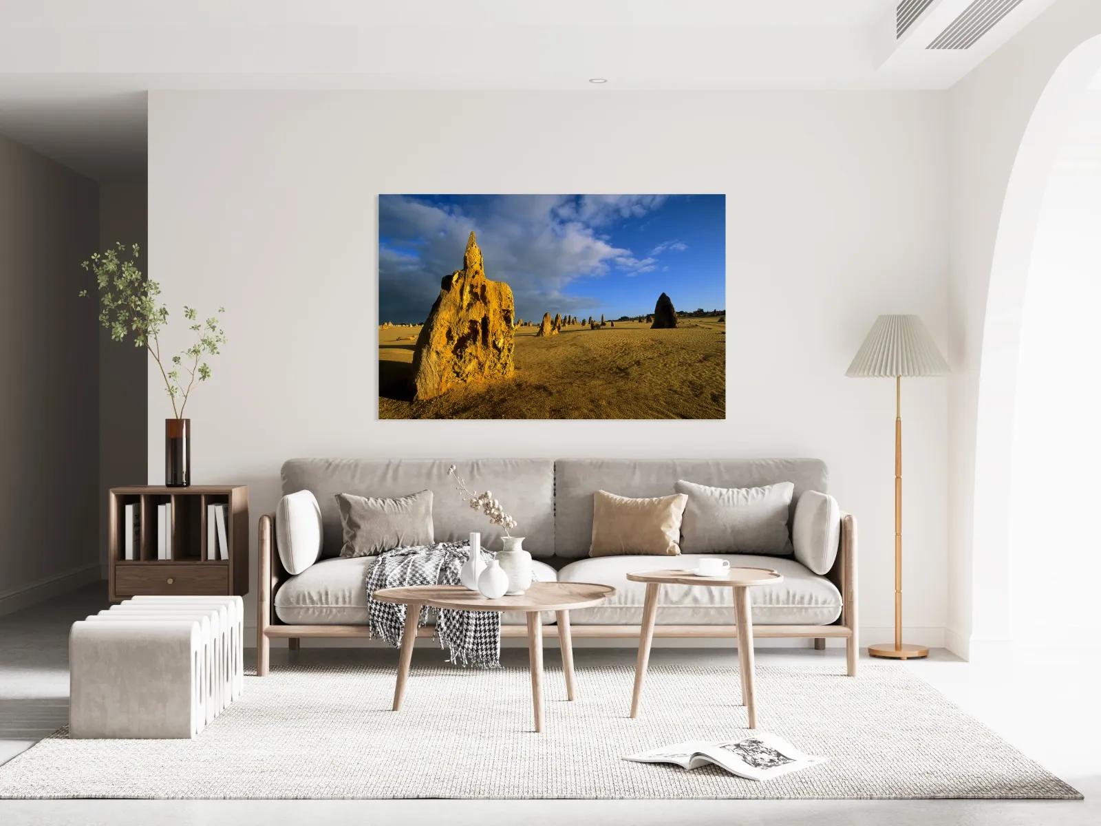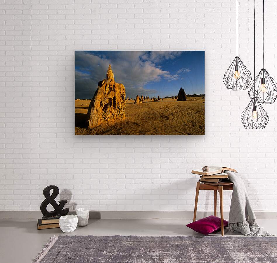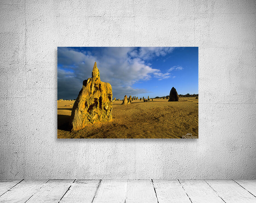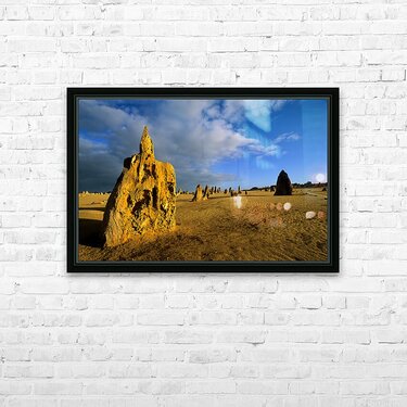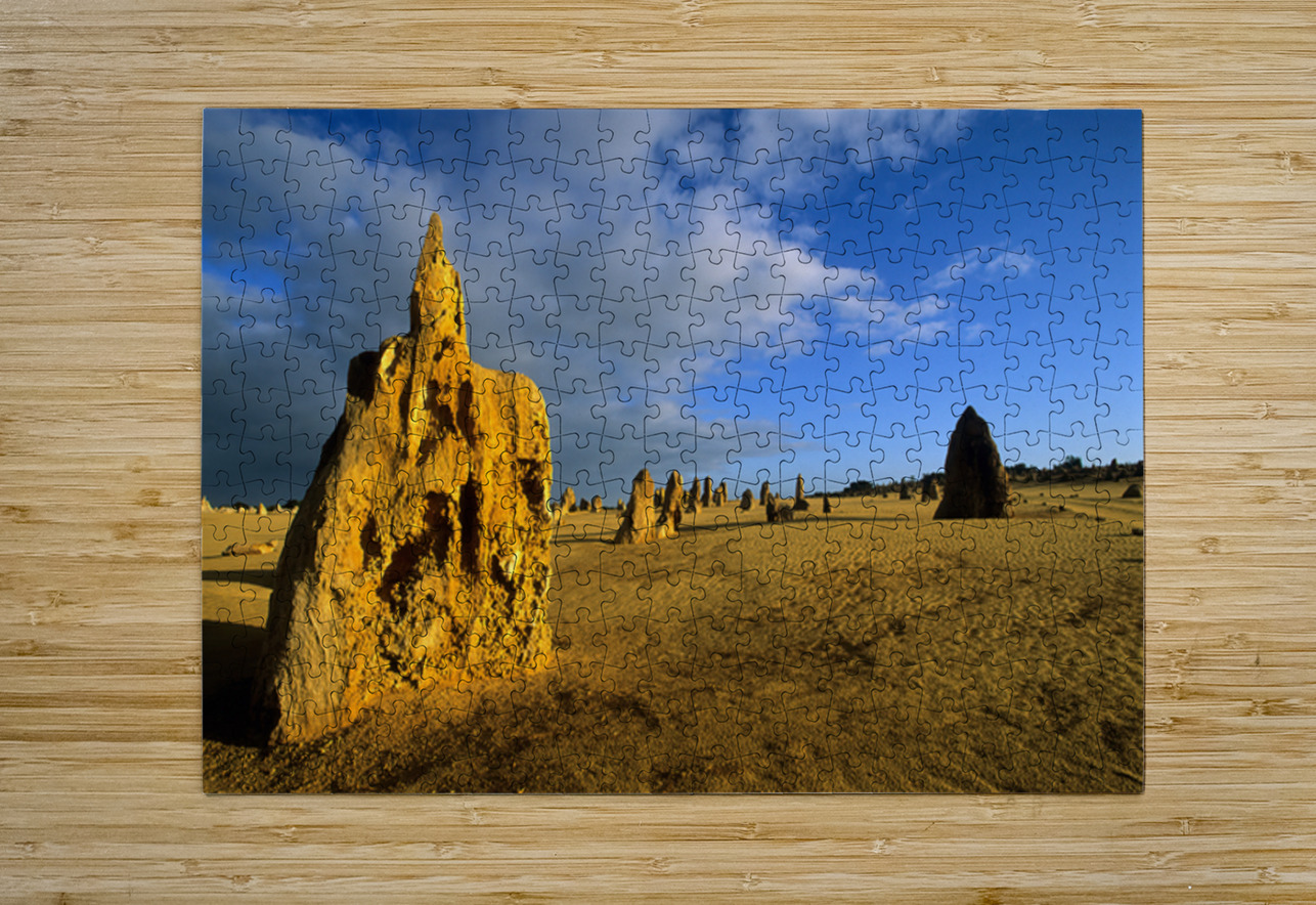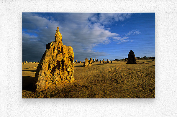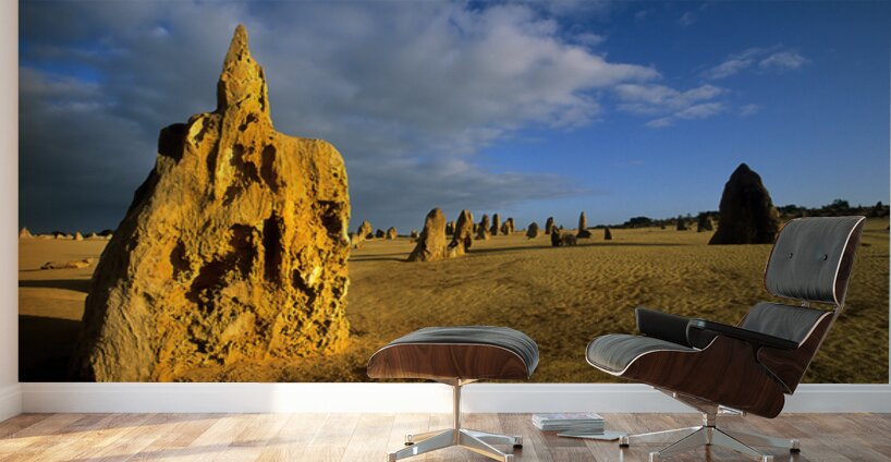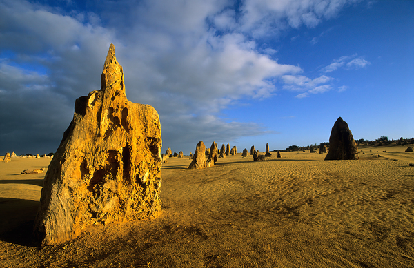 The Pinnacles ancient limestone formations stand in the desert of Nambung National Park Western Australia under a dramatic sky at sunset.
