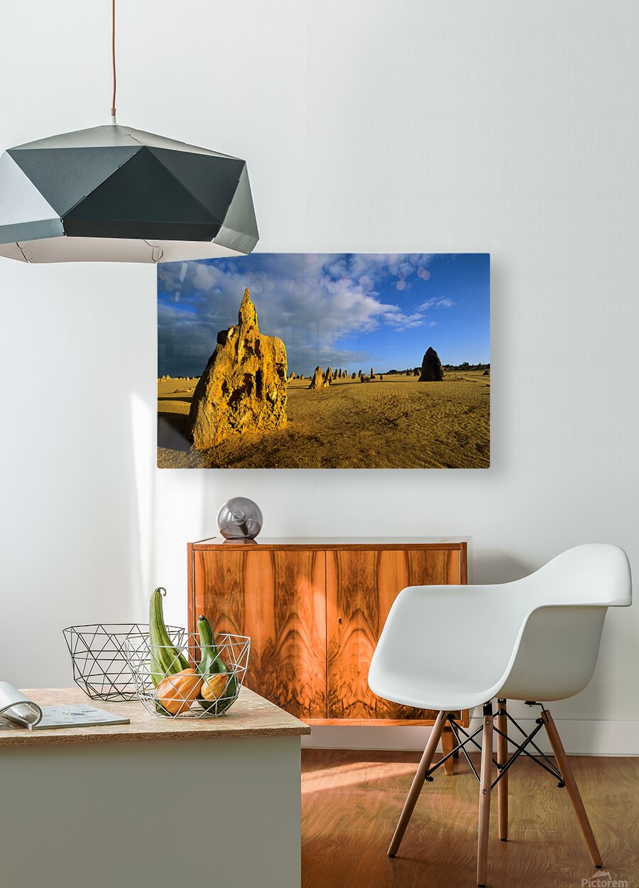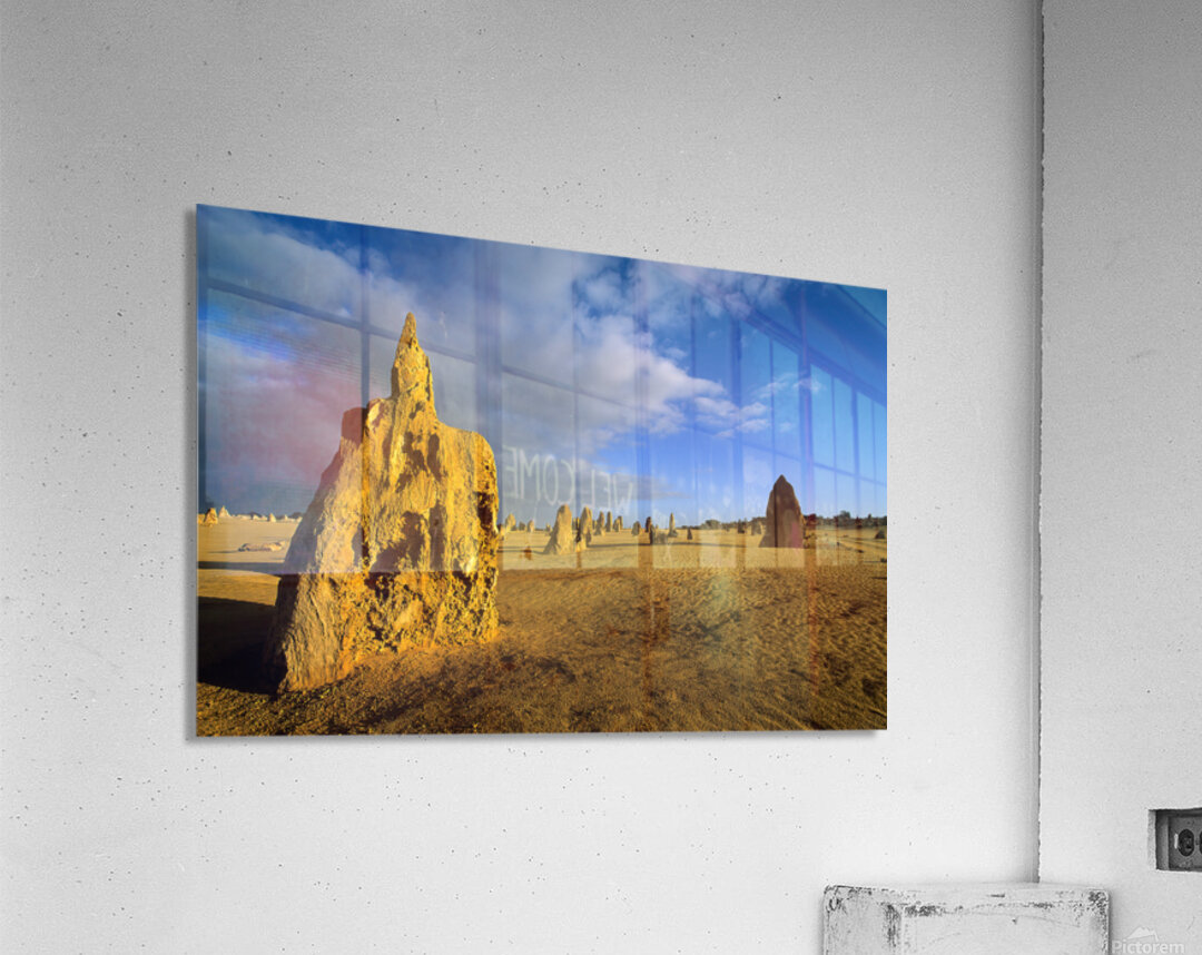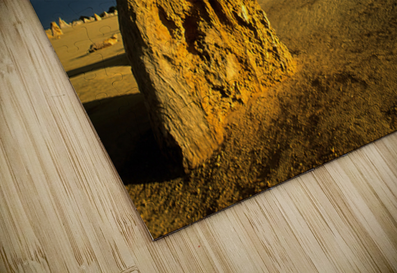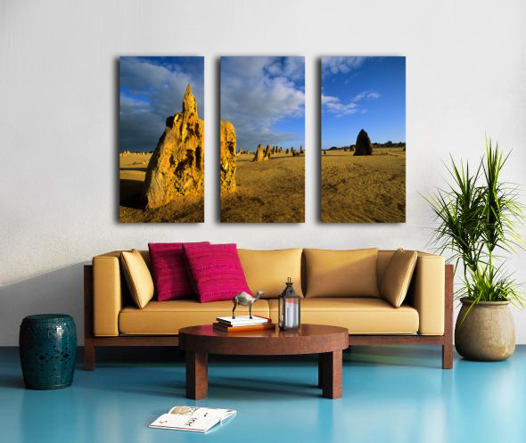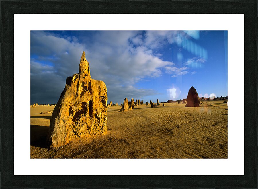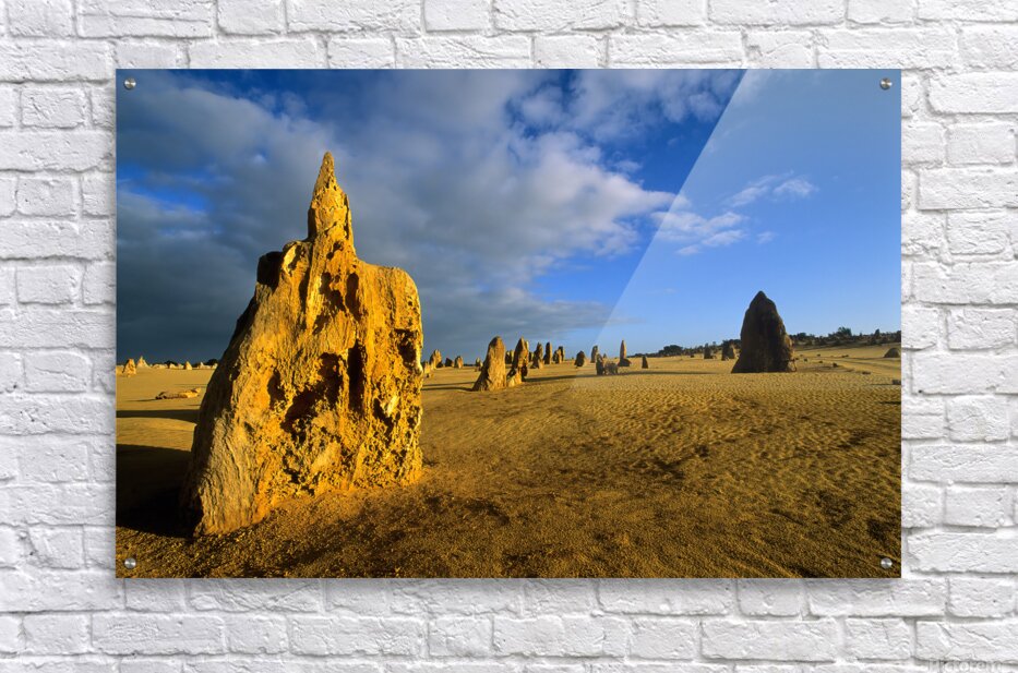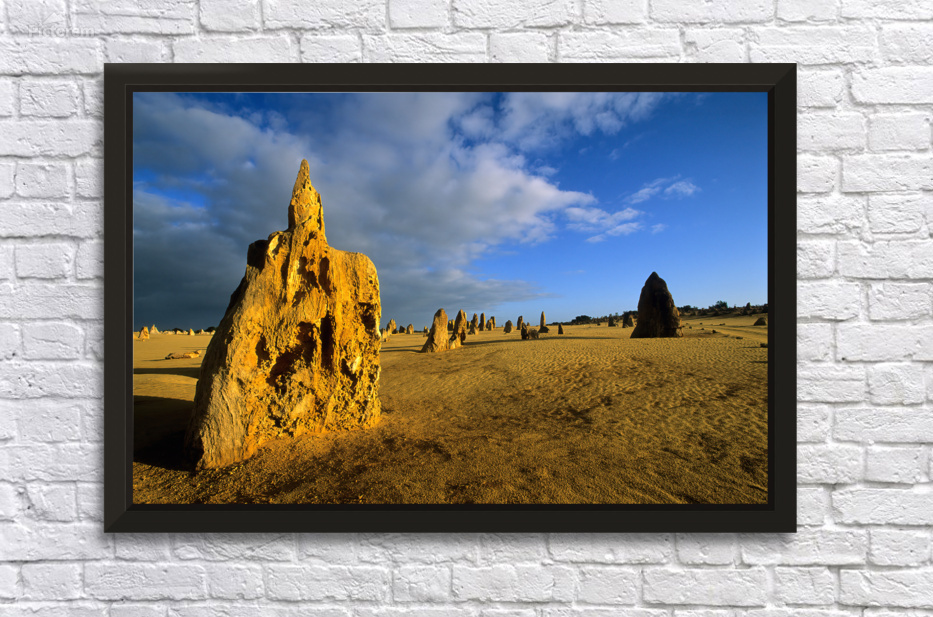 The Pinnacles ancient limestone formations stand in the desert of Nambung National Park Western Australia under a dramatic sky at sunset.