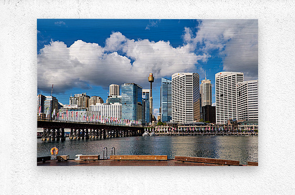 Darling Harbour Sydney Australia. A vibrant waterfront precinct with modern skyscrapers a historic railway bridge and flags fluttering in the breeze u...[+]