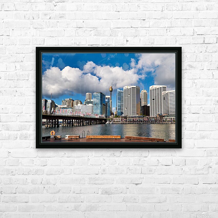 Sydney Harbour skyline with bridge and buildings under clouds. Frame print