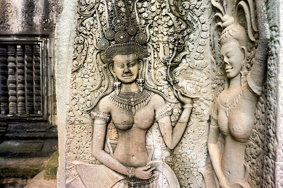 Intricate stone carvings of Apsaras celestial nymphs adorn the walls of Angkor Wat in Siem Reap Cambodia depicting figures from Hindu mythology.