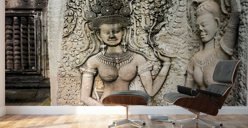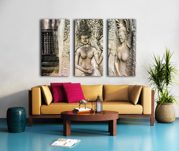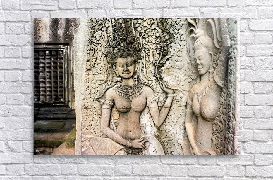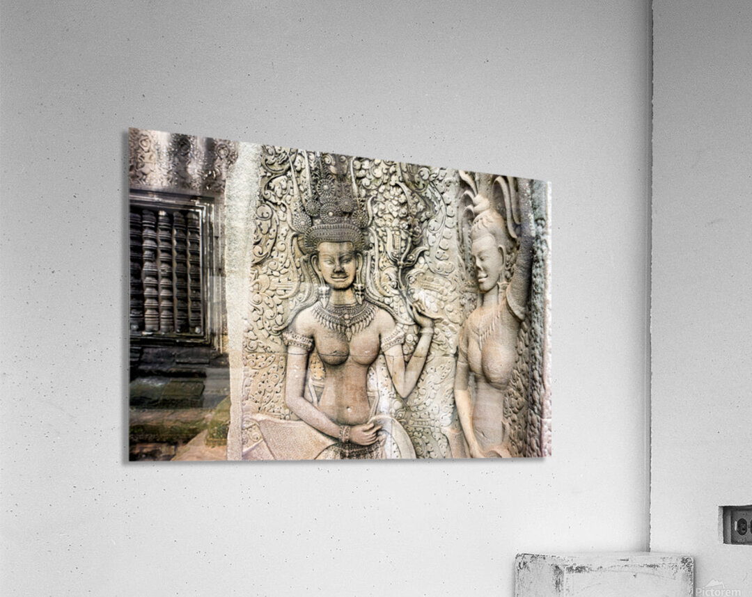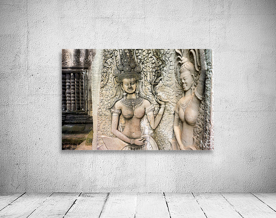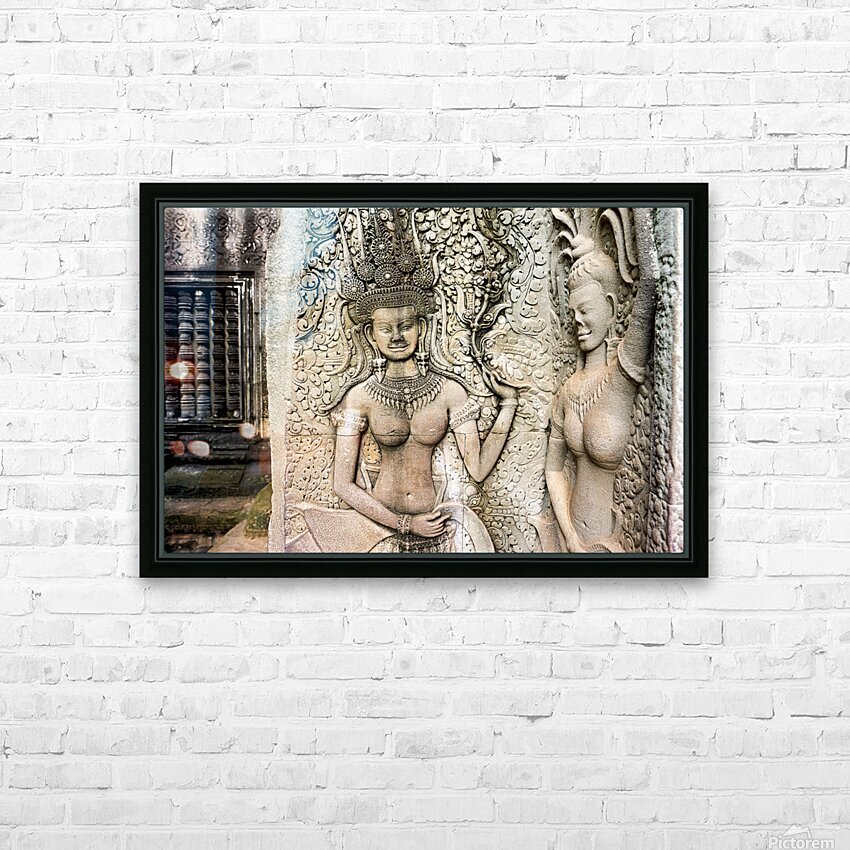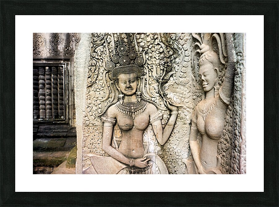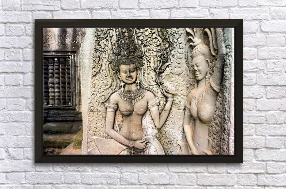 "Angkor Wat temple wall with detailed Apsara stone carvings." in a framed print.