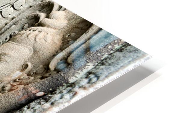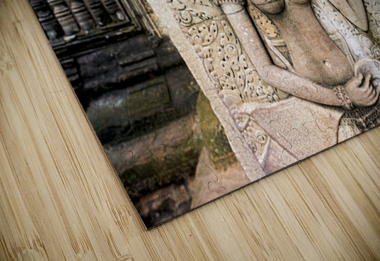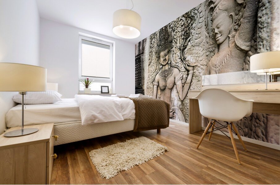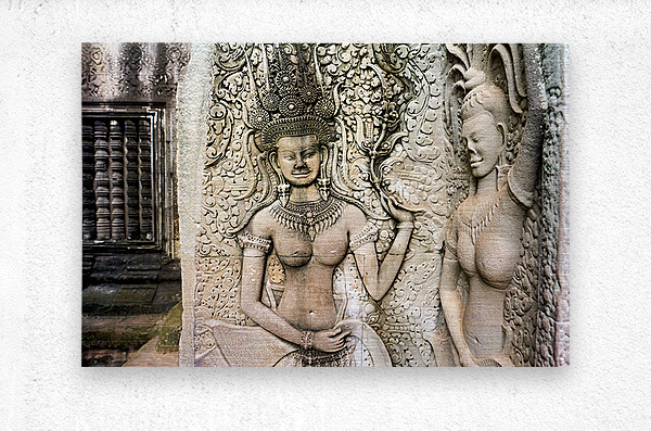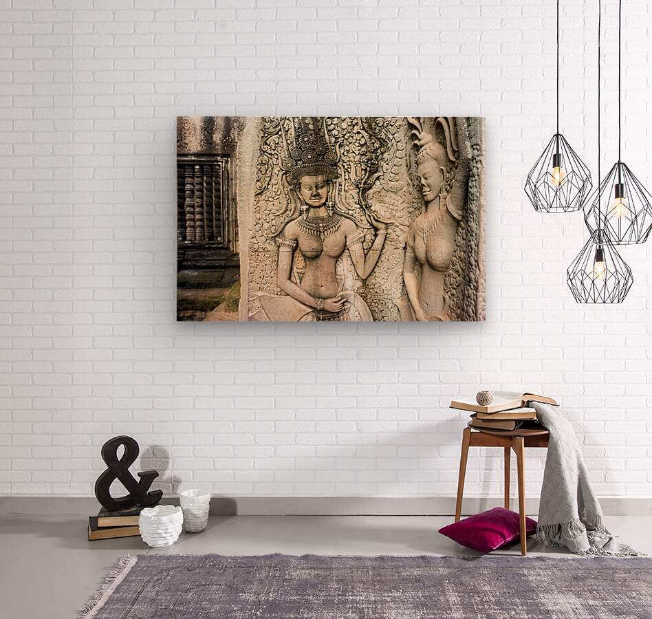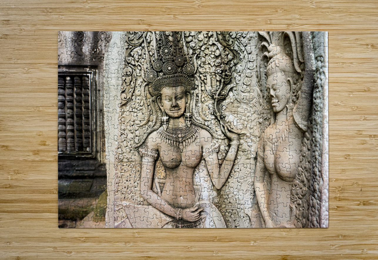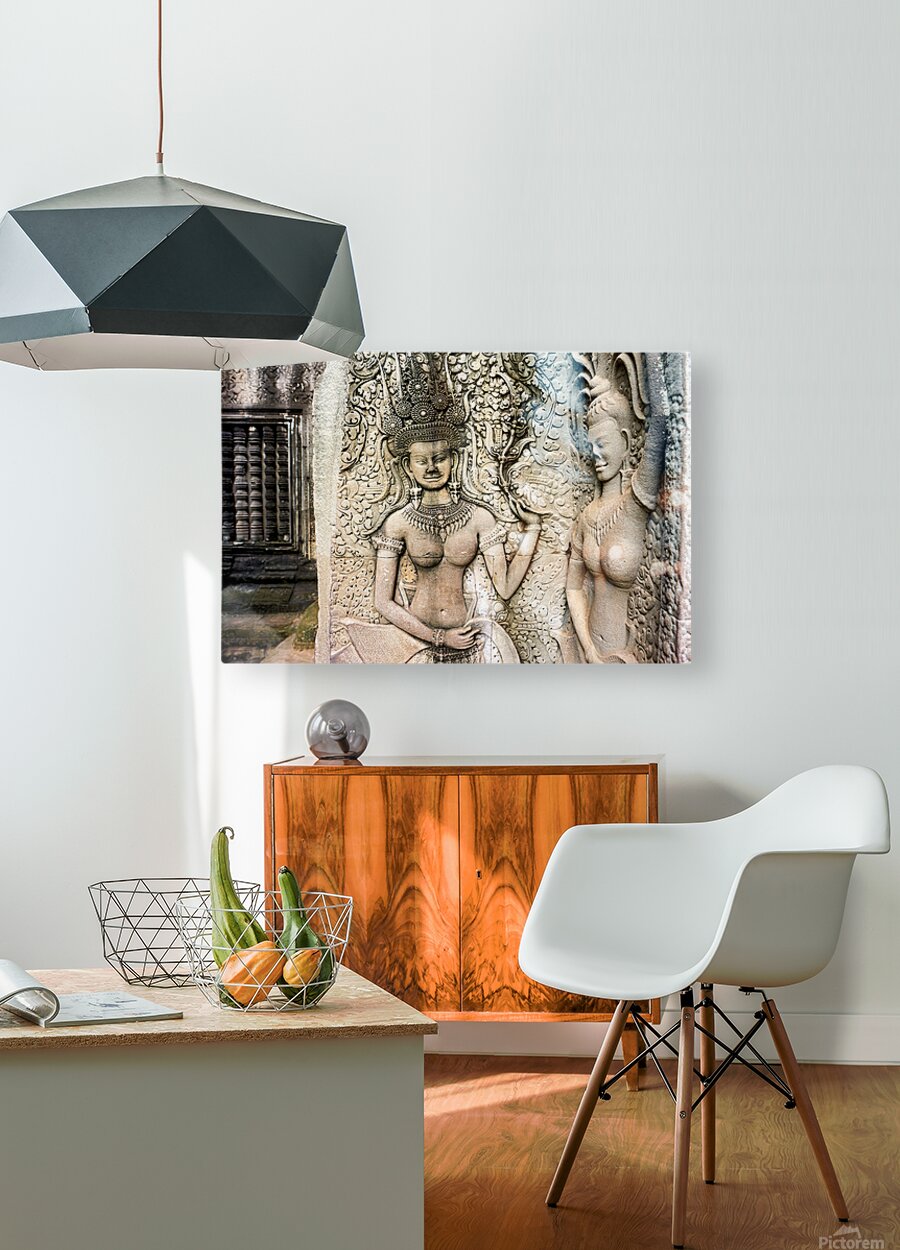 "Angkor Wat temple wall with detailed Apsara stone carvings." in a framed print.