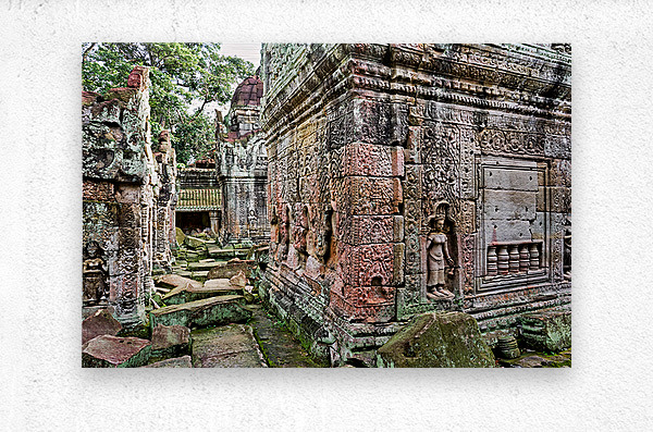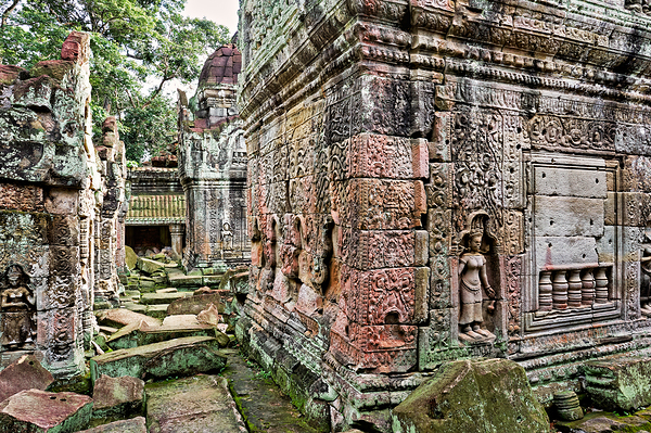 Ancient Khmer temple ruins possibly Angkor Wat in Cambodia featuring intricate stone carvings and moss-covered blocks showcasing historical architectu