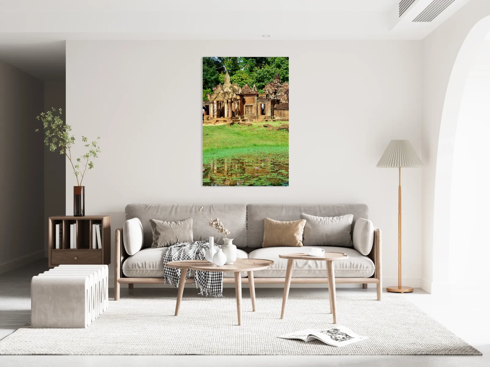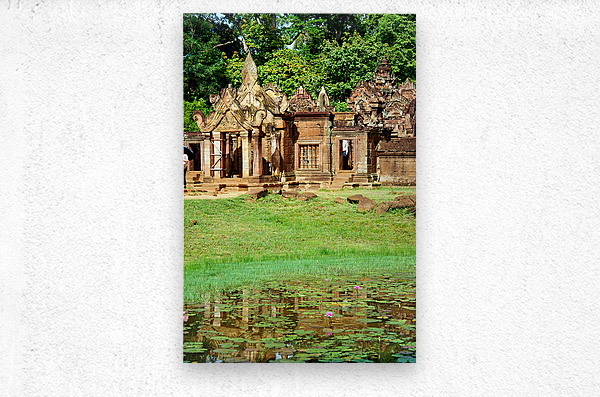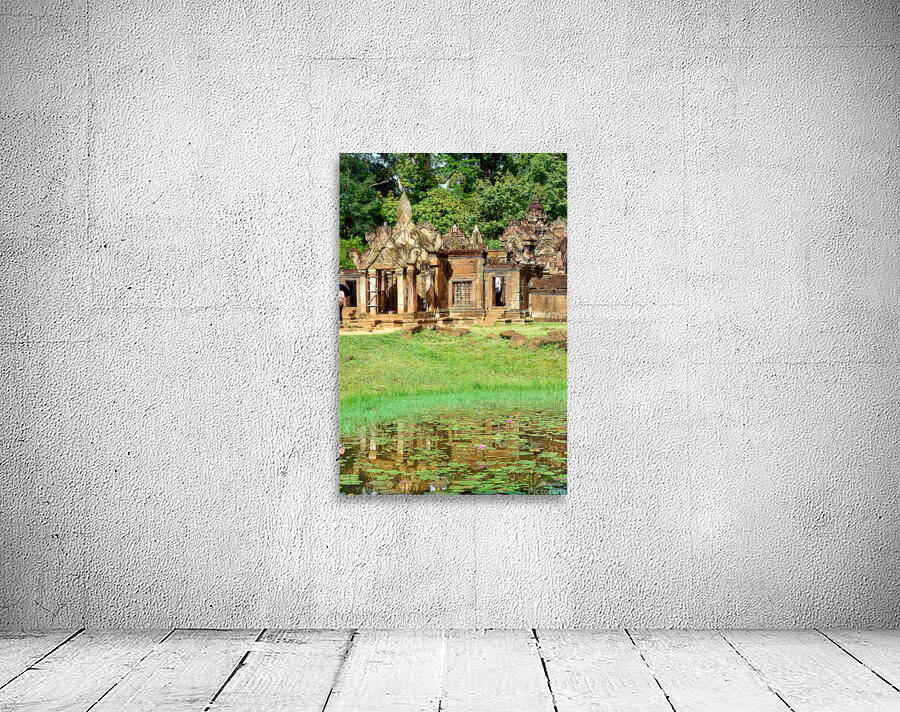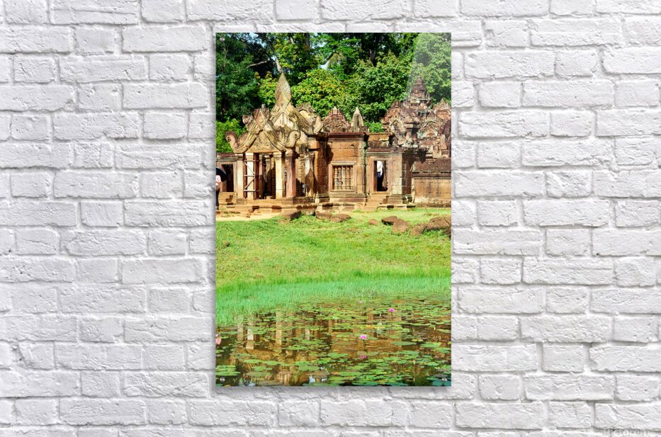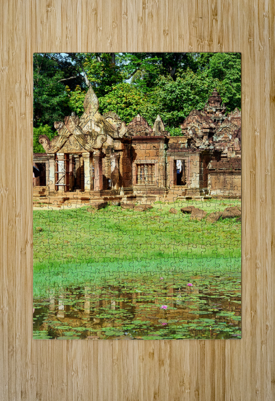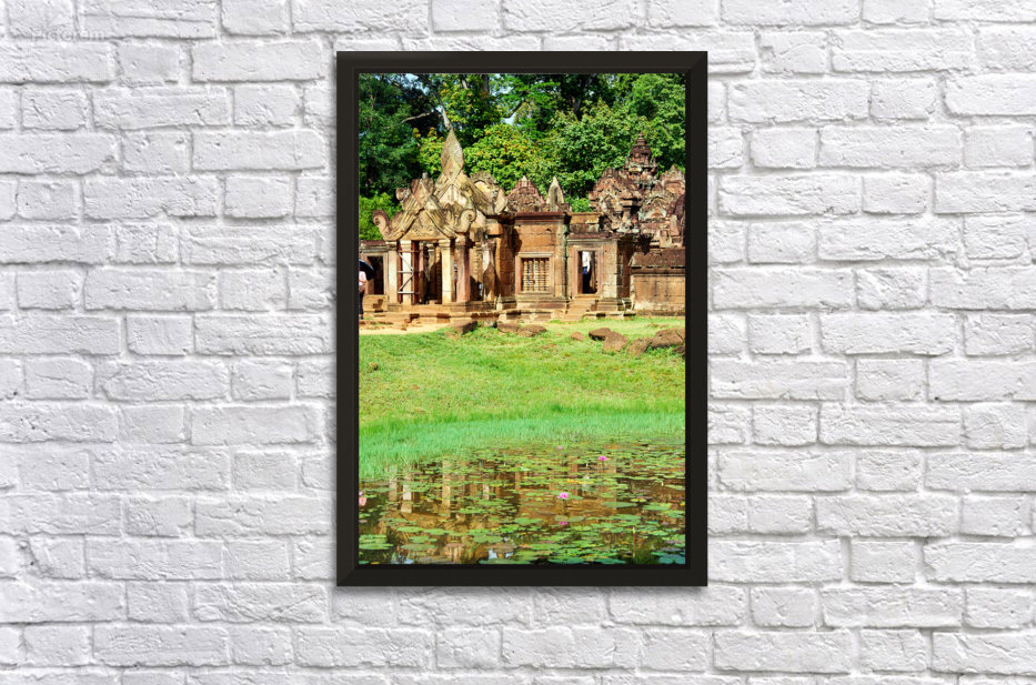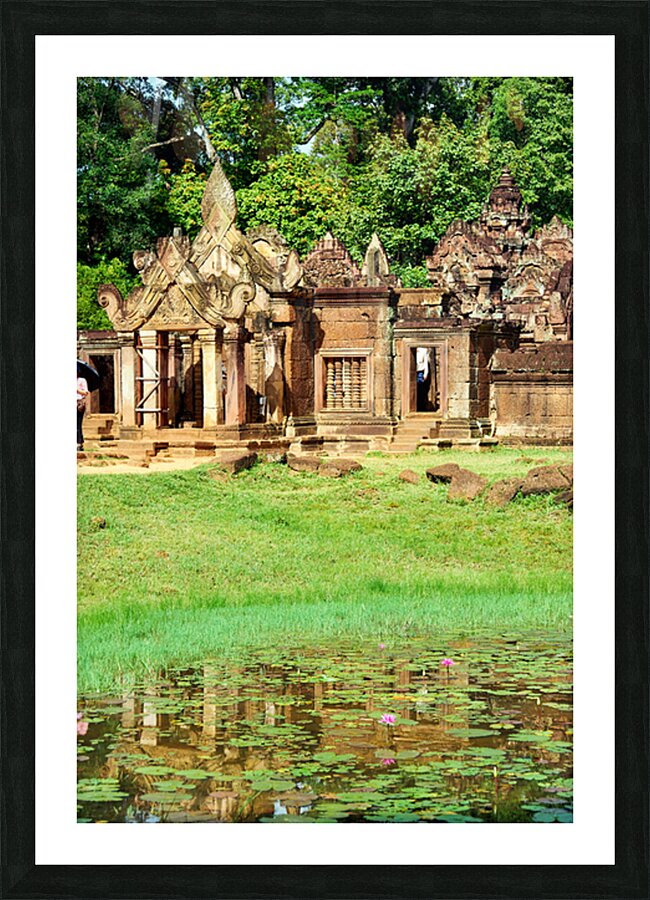 Tourists explore Banteay Srei temple in Angkor Cambodia a 10th-century Khmer temple known for its pink sandstone reflected in a lily pond.