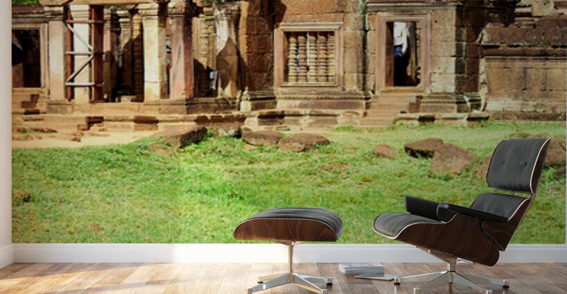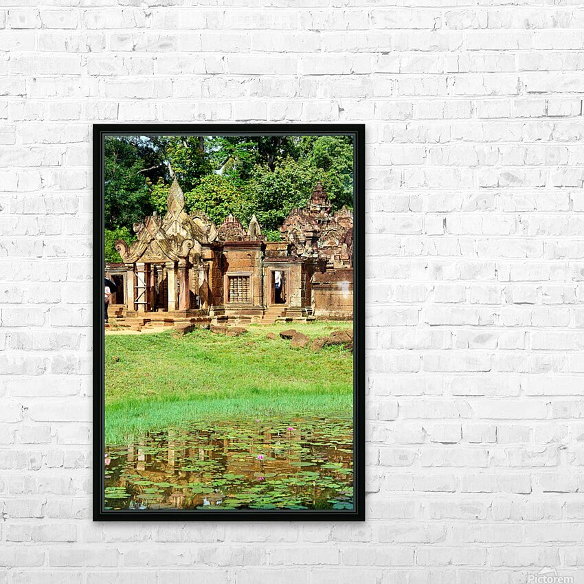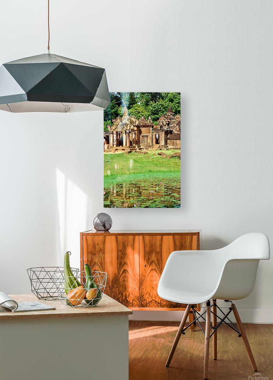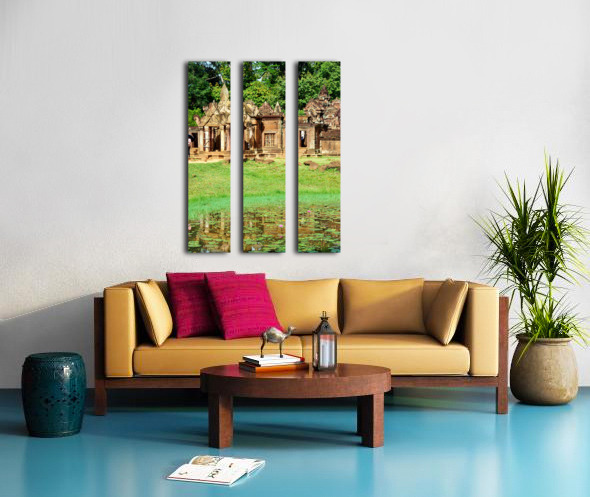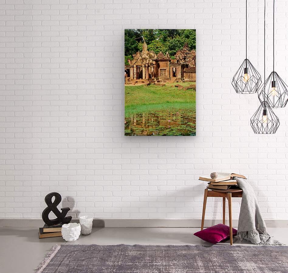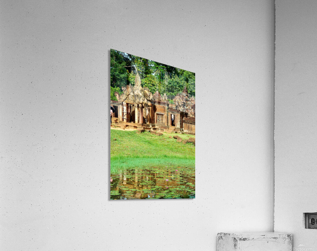 Tourists explore Banteay Srei temple in Angkor Cambodia a 10th-century Khmer temple known for its pink sandstone reflected in a lily pond.