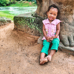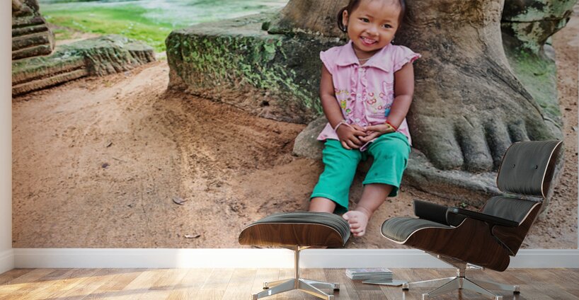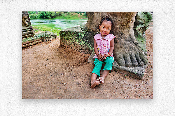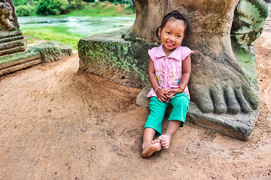 A young Cambodian girl smiles while resting against an ancient stone carving at a temple possibly Angkor Wat in Siem Reap Cambodia.