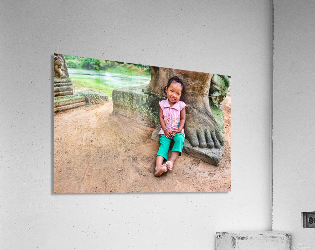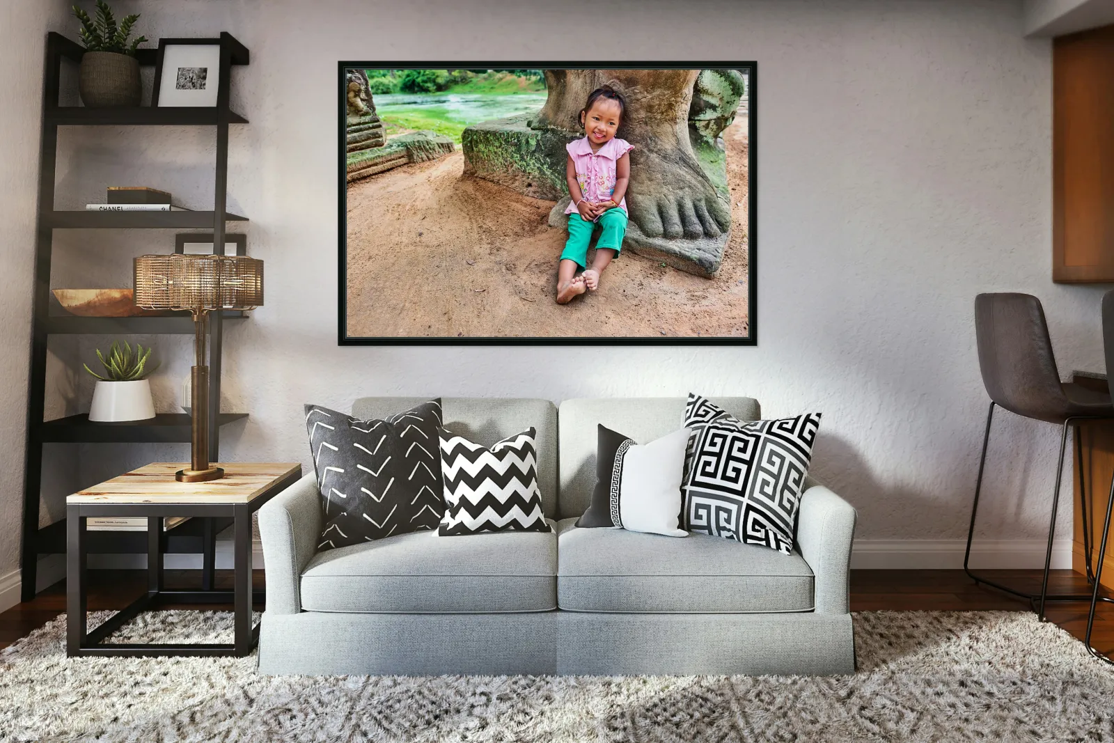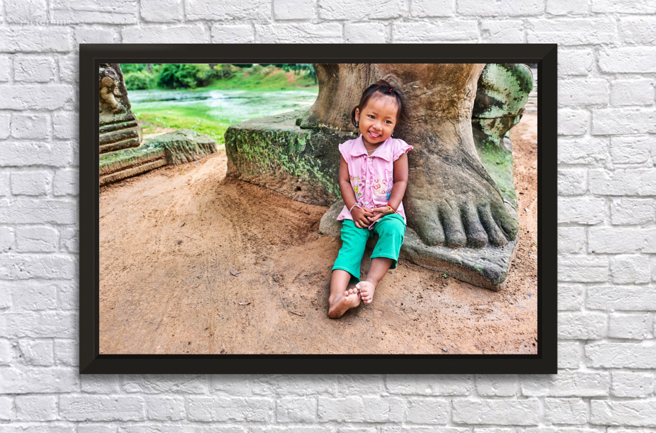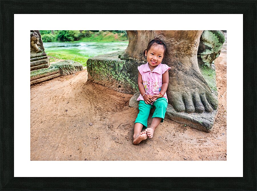 "Smiling girl sits by ancient stone structure." in a framed print.
