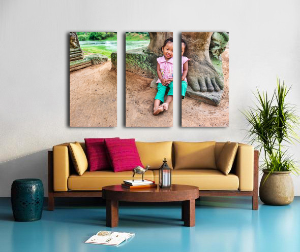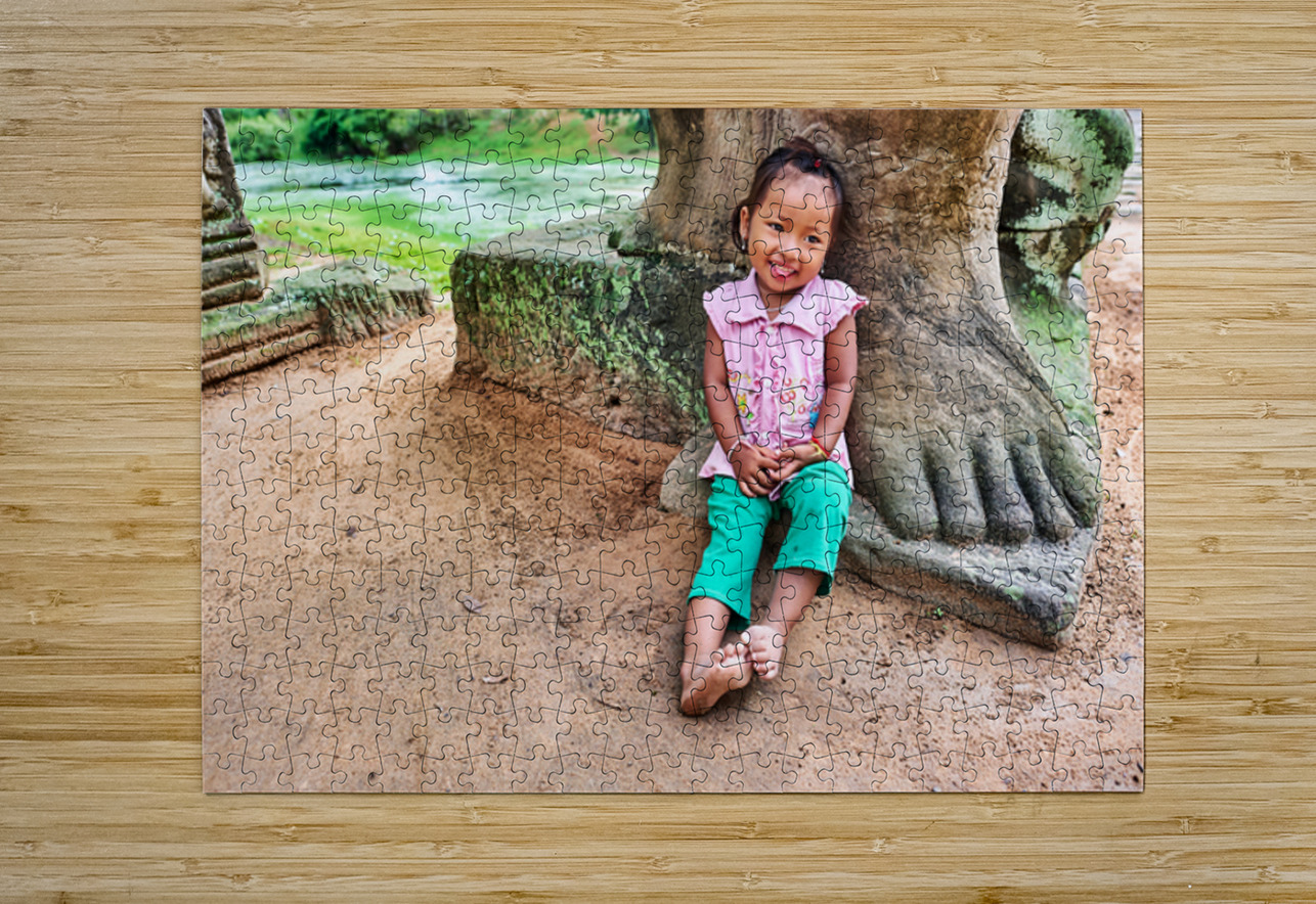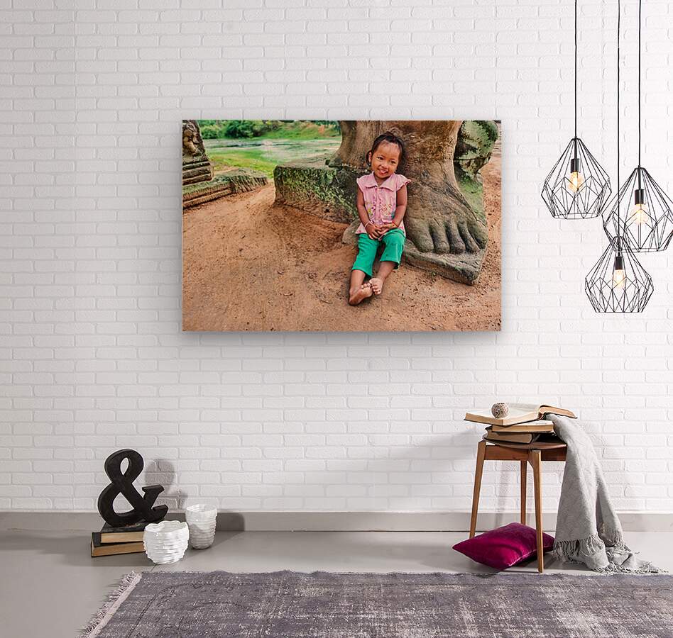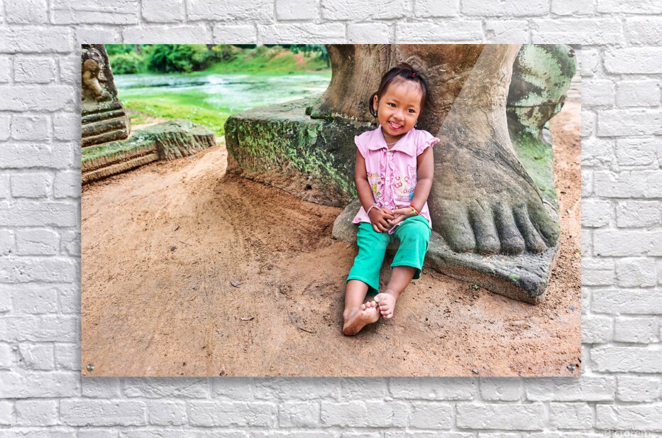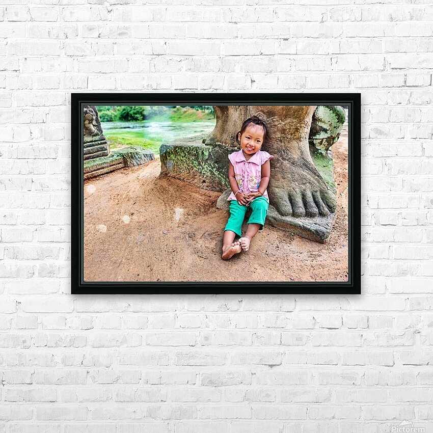 "Smiling girl sits by ancient stone structure." in a framed print.
