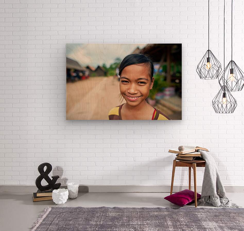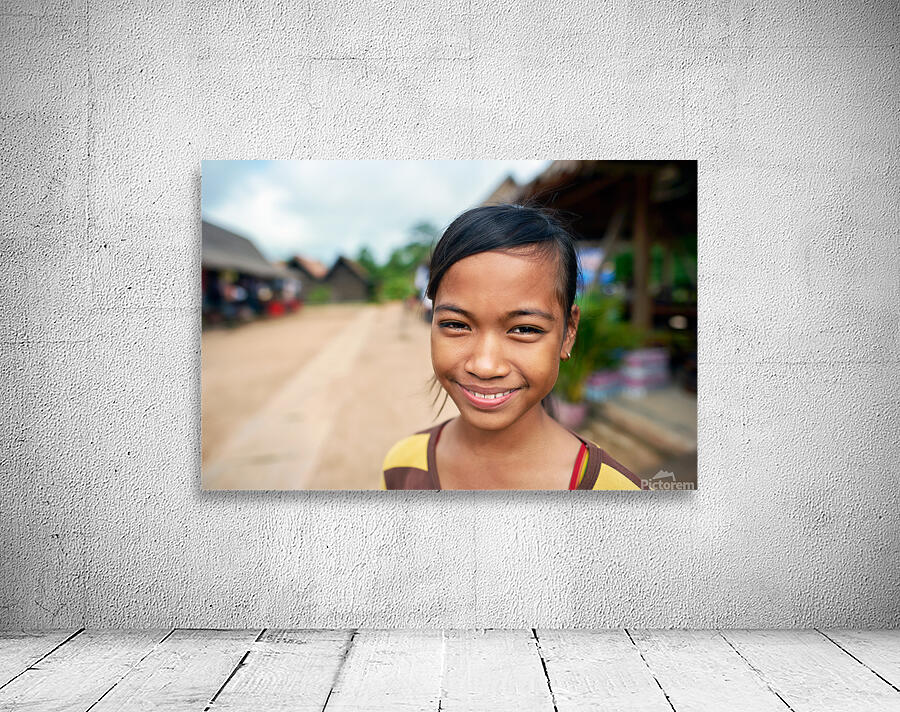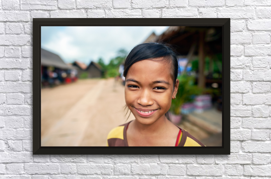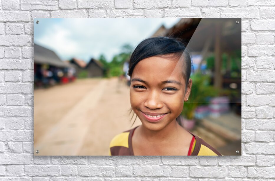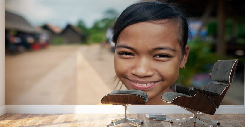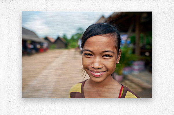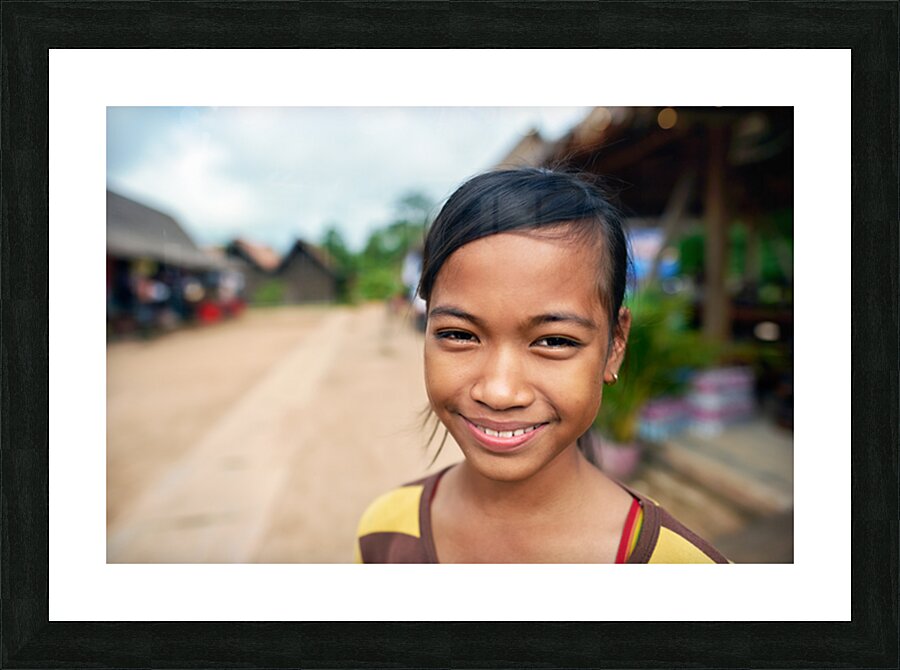 A young girl smiles warmly at the camera in a rural village likely in Southeast Asia conveying a sense of innocence and welcome.