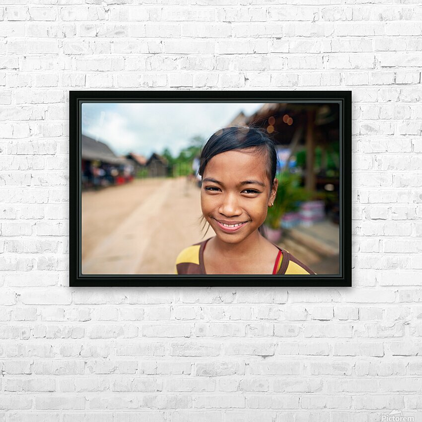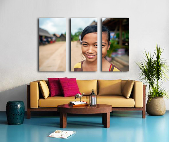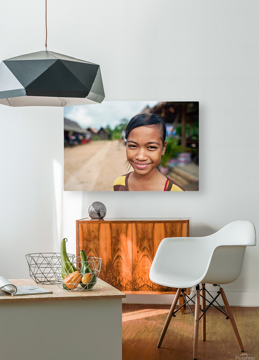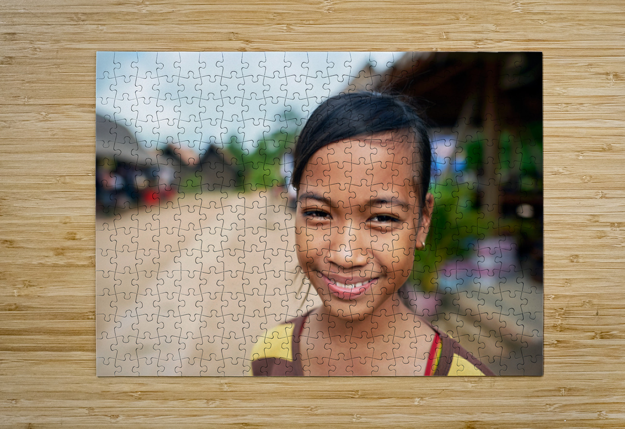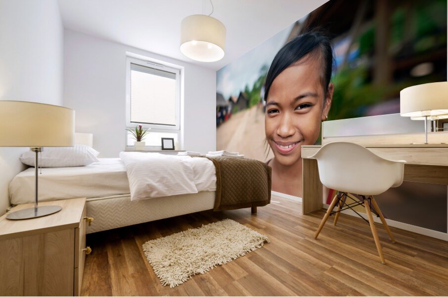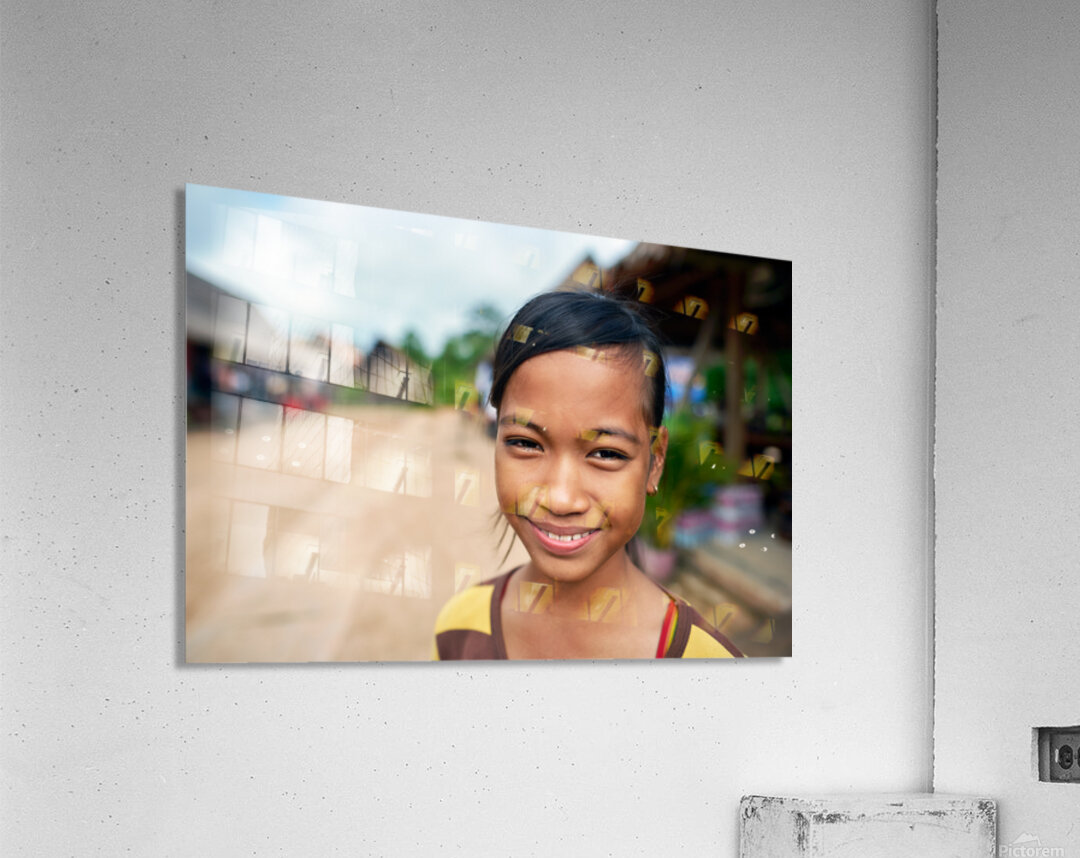 A young girl smiles warmly at the camera in a rural village likely in Southeast Asia conveying a sense of innocence and welcome.