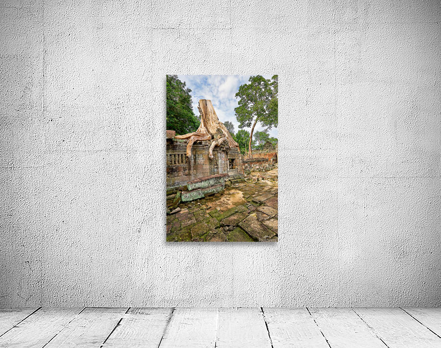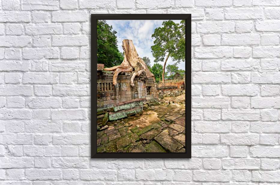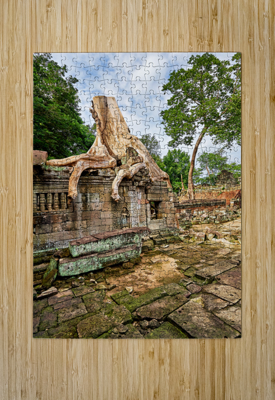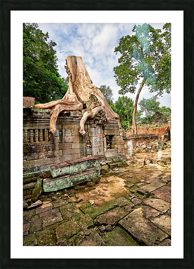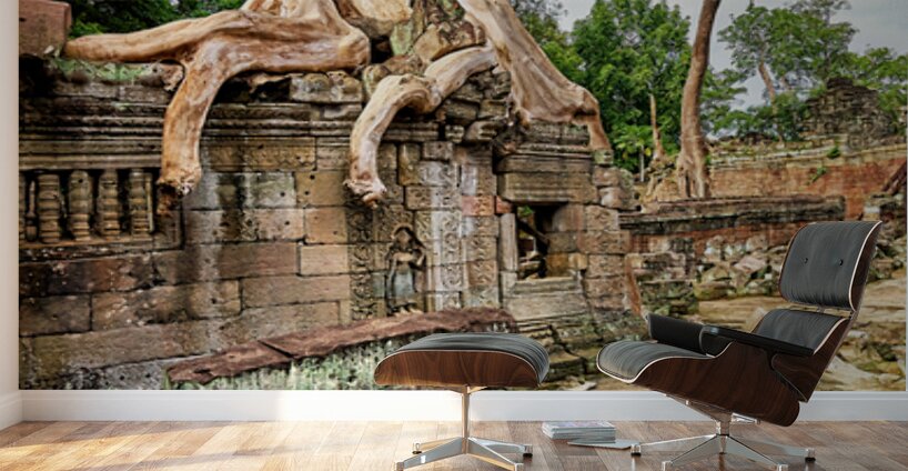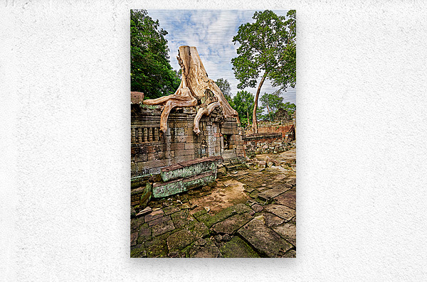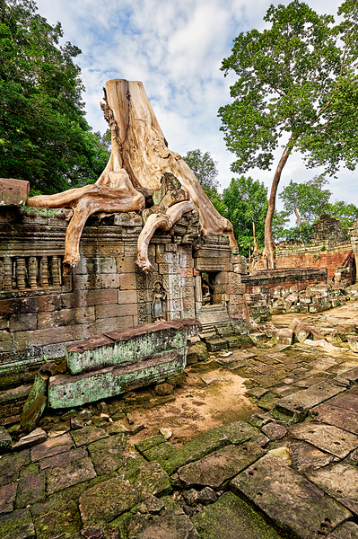Massive tree roots engulf ancient temple ruins at Angkor Cambodia showcasing natures powerful reclamation of historical sites over centuries.