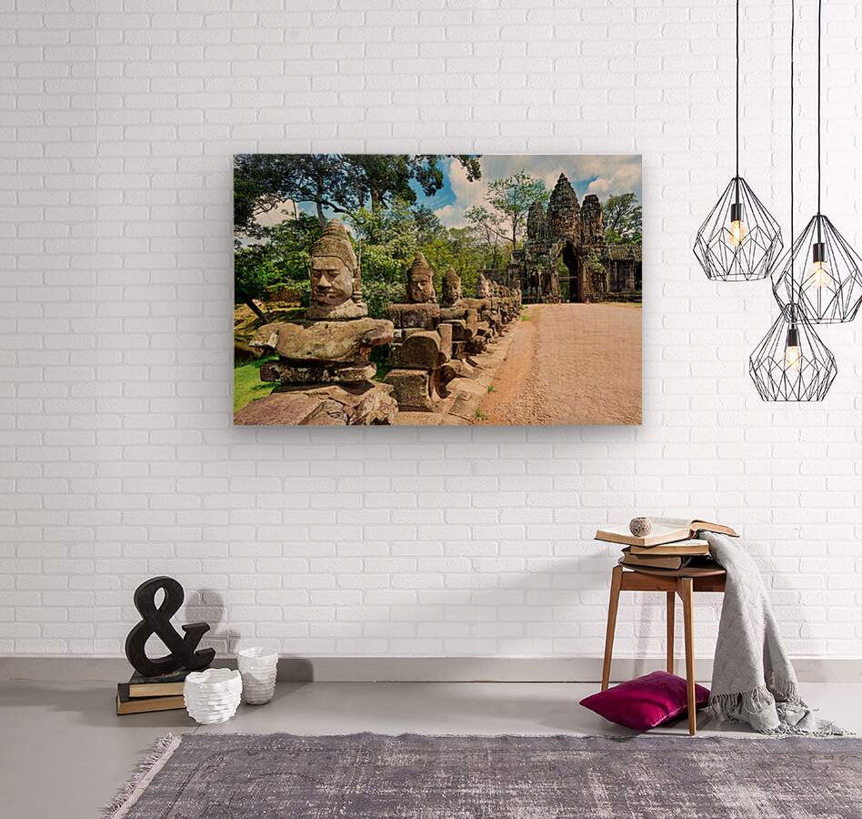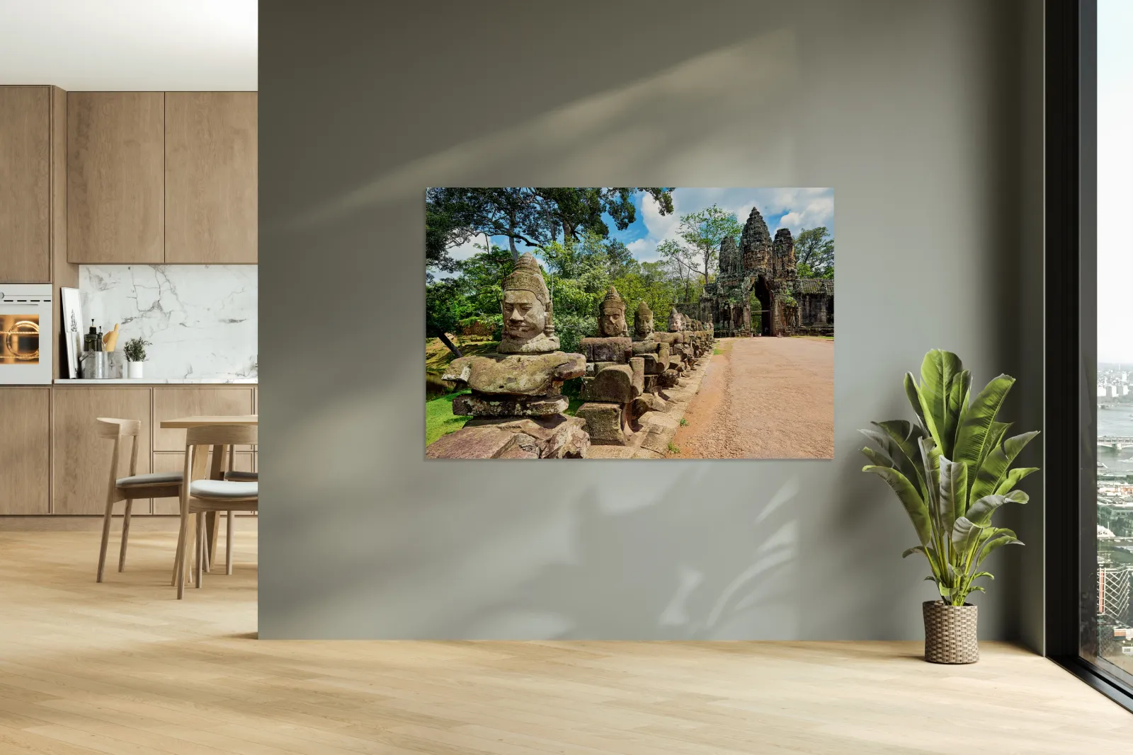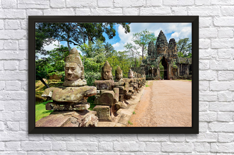 Stone statues of deities and asuras line the causeway leading to the South Gate of Angkor Thom Siem Reap Cambodia depicting the Churning of the Ocean