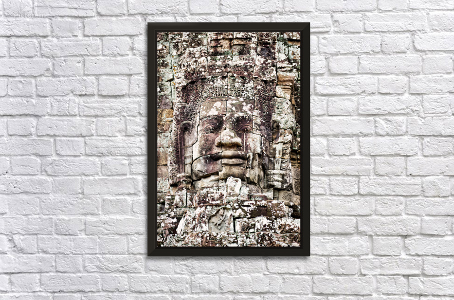 "Ancient Khmer stone face Bayon temple." in a framed print.