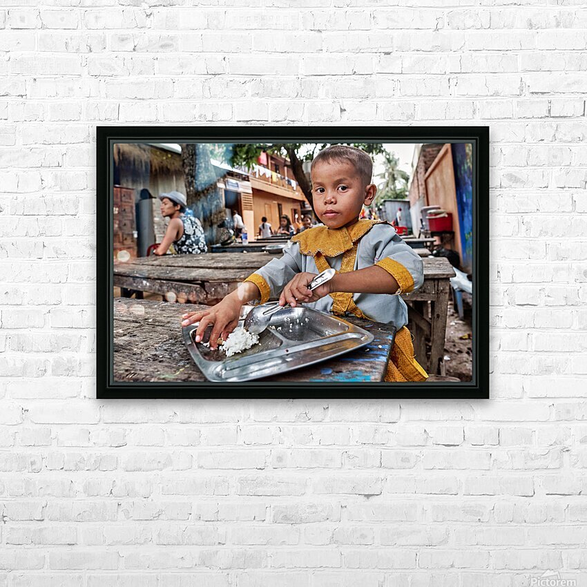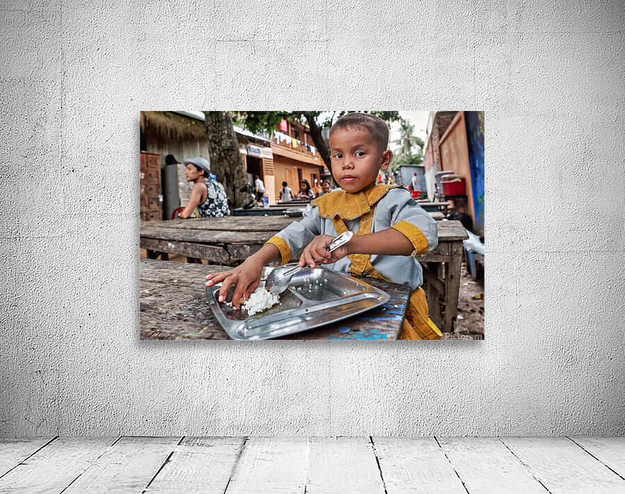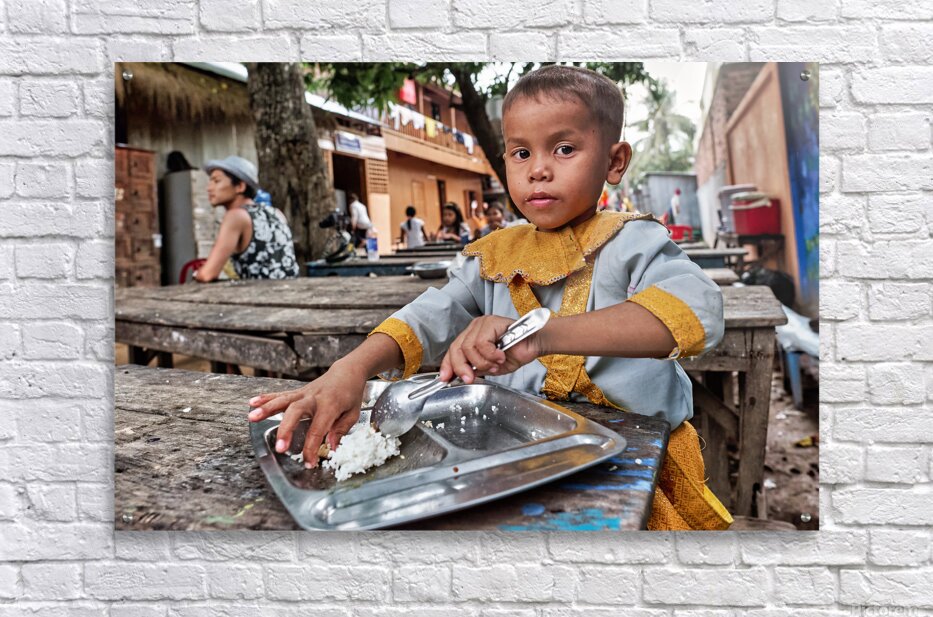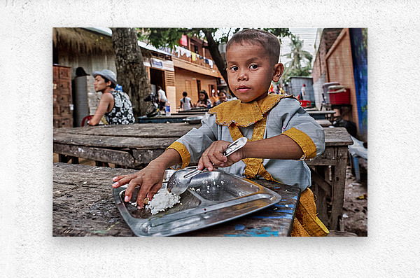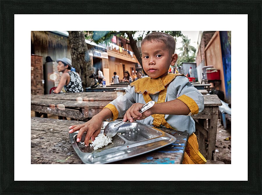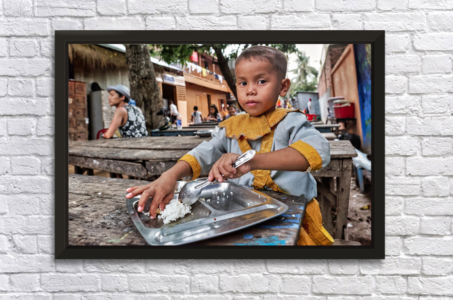 "Child in traditional dress eating rice outdoors." in a framed print.