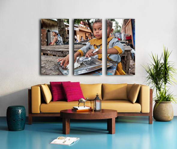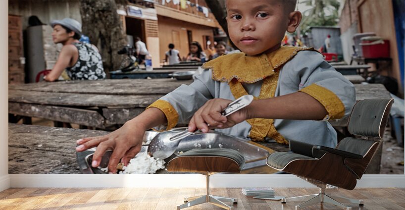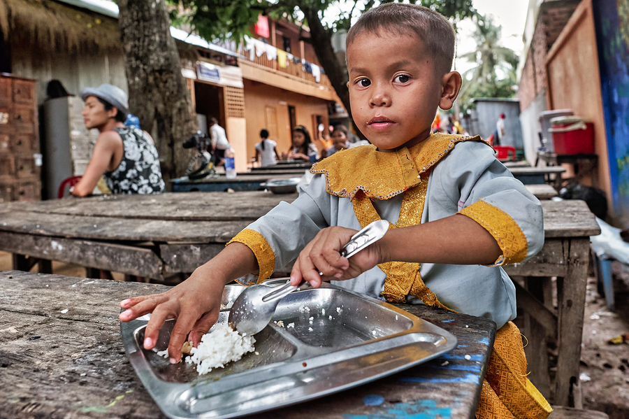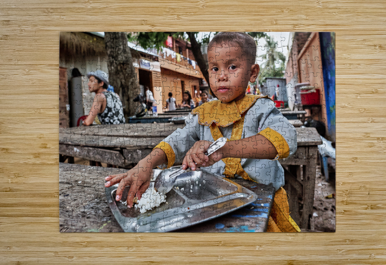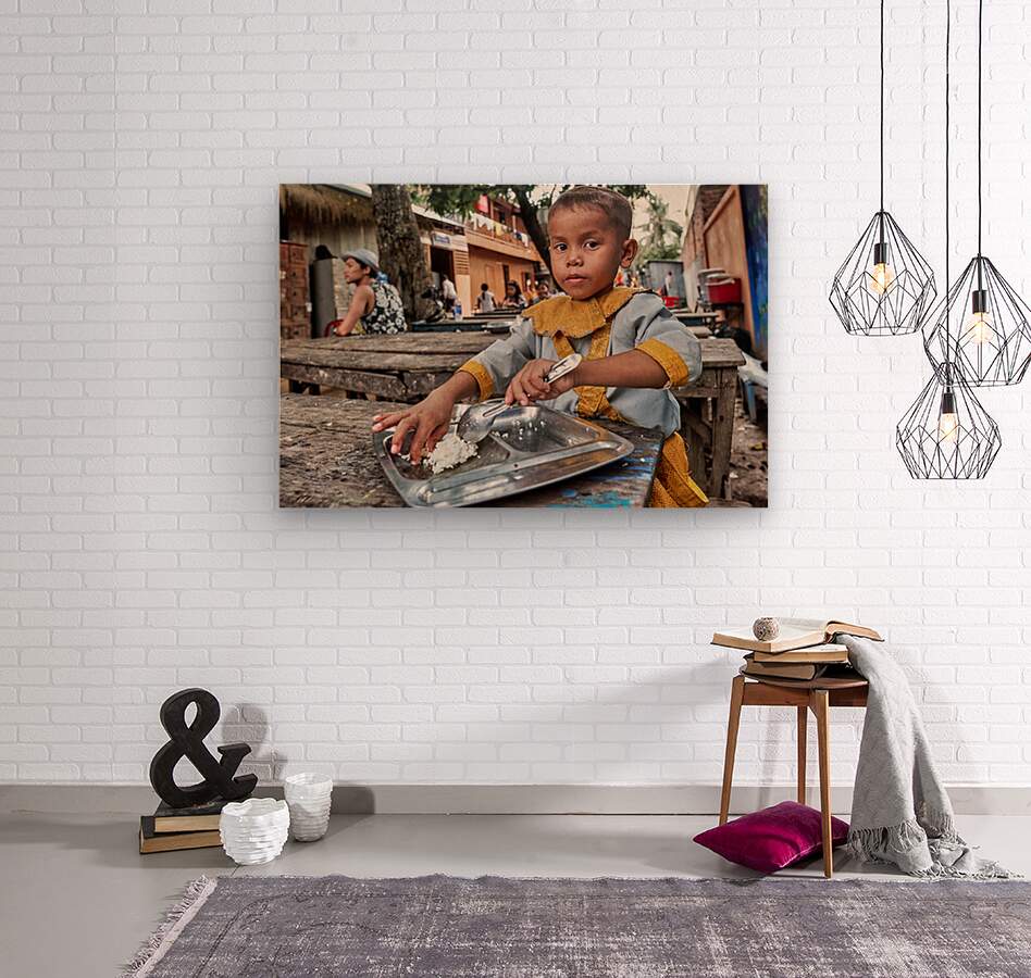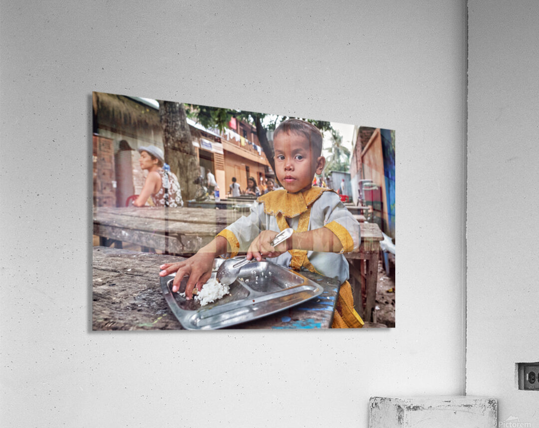 "Child in traditional dress eating rice outdoors." in a framed print.