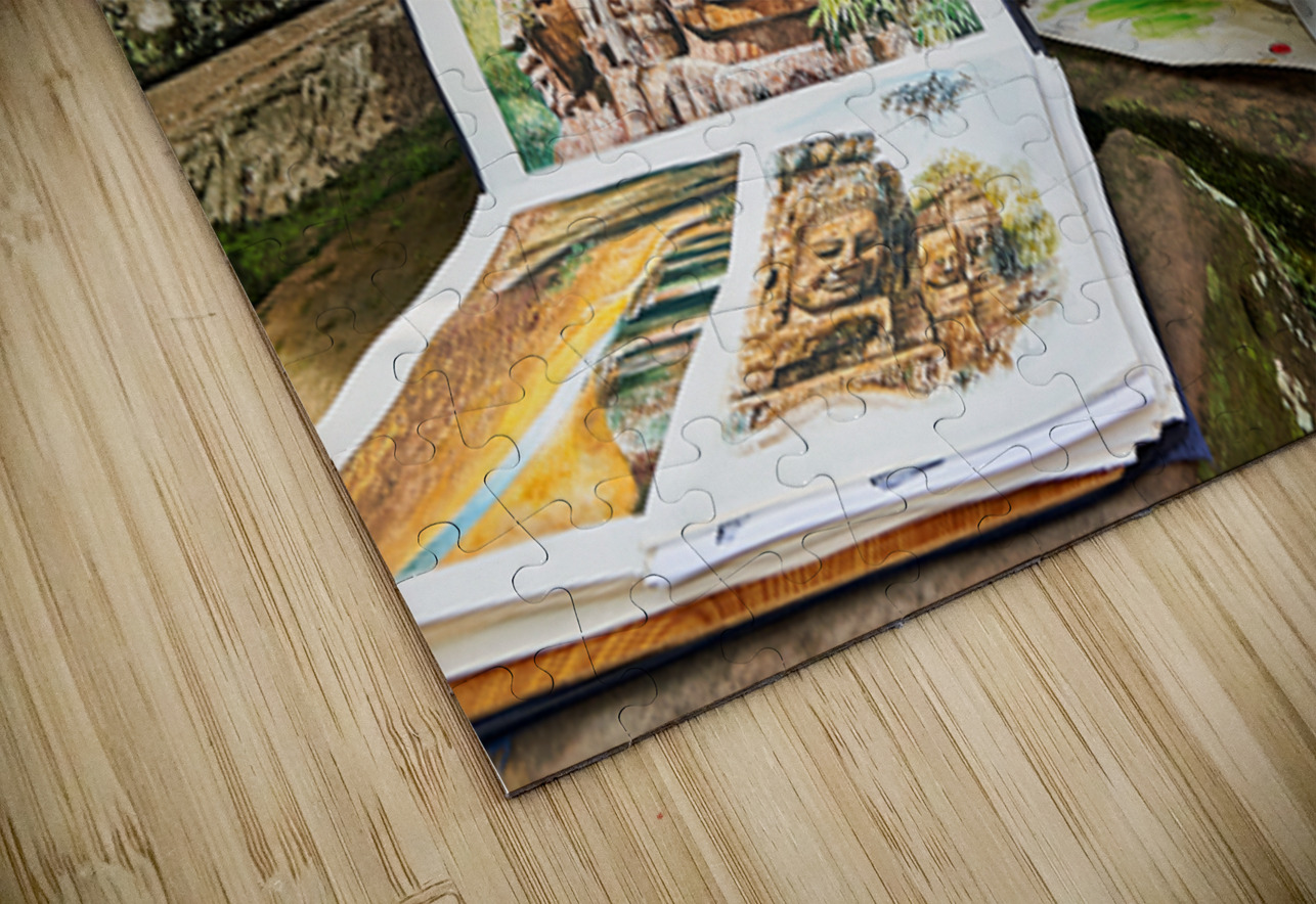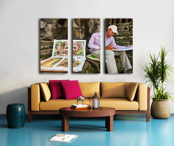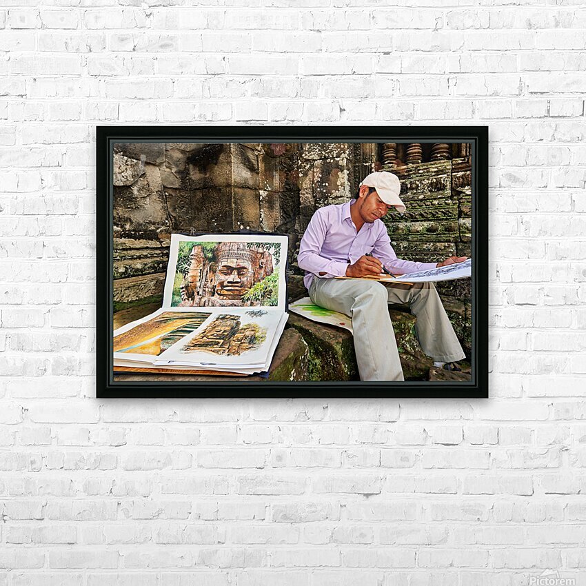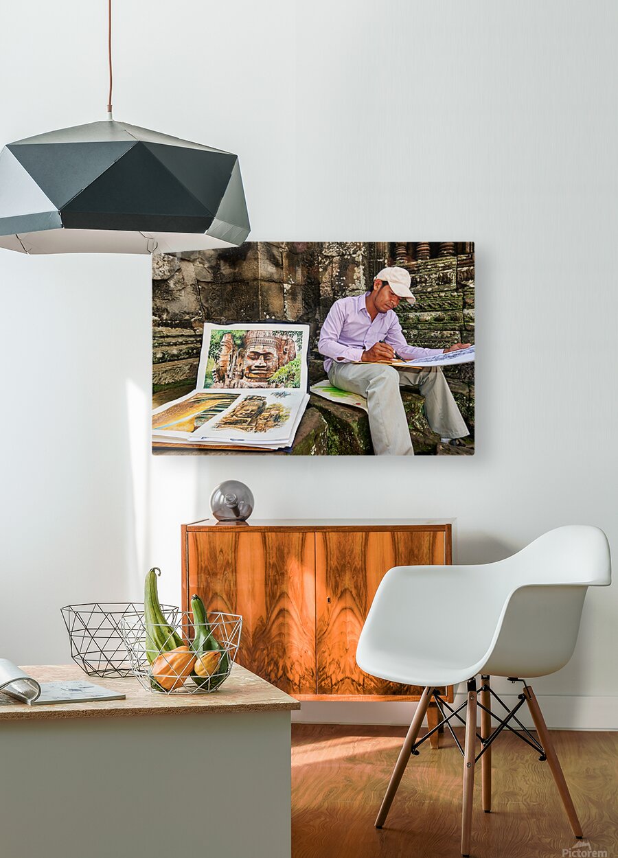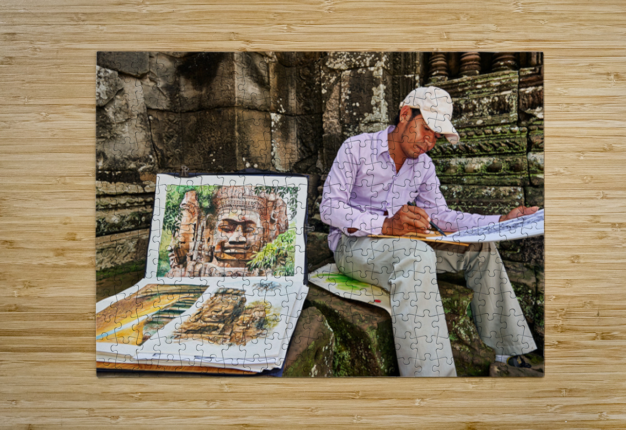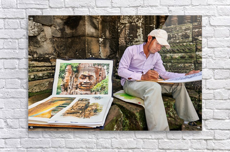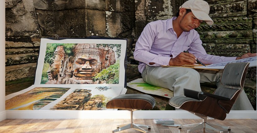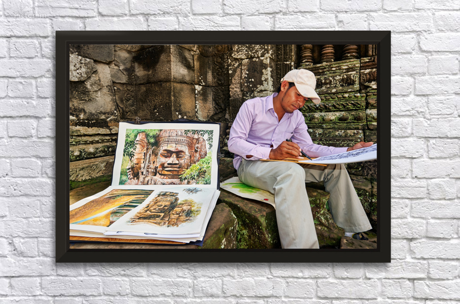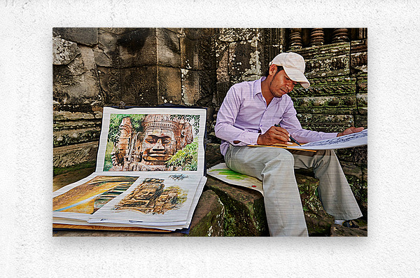 A Cambodian artist draws intricate temple faces inspired by the ancient ruins of Angkor Thom Siem Reap Cambodia offering his art for sale.