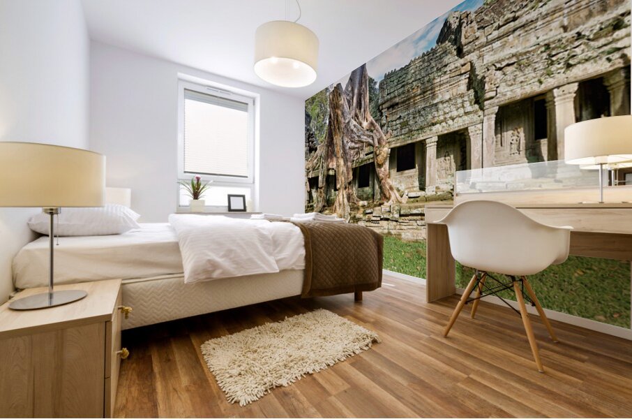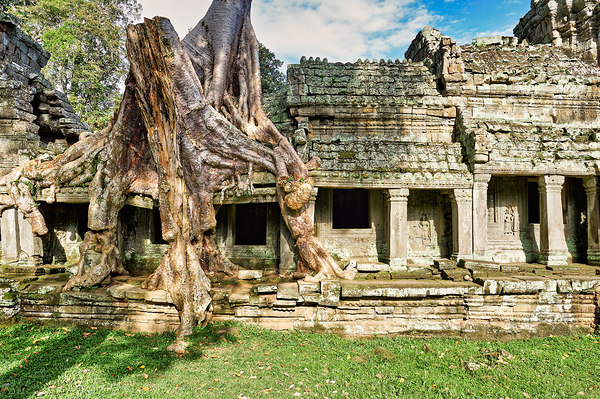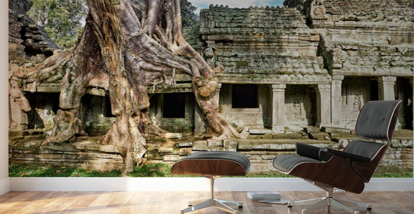 Giant tree roots embrace the ancient stone temple of Ta Prohm in Angkor Cambodia showcasing natures power over man-made structures.
