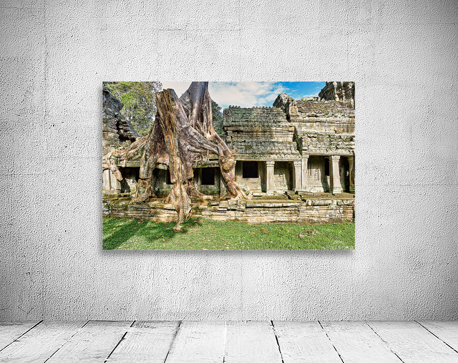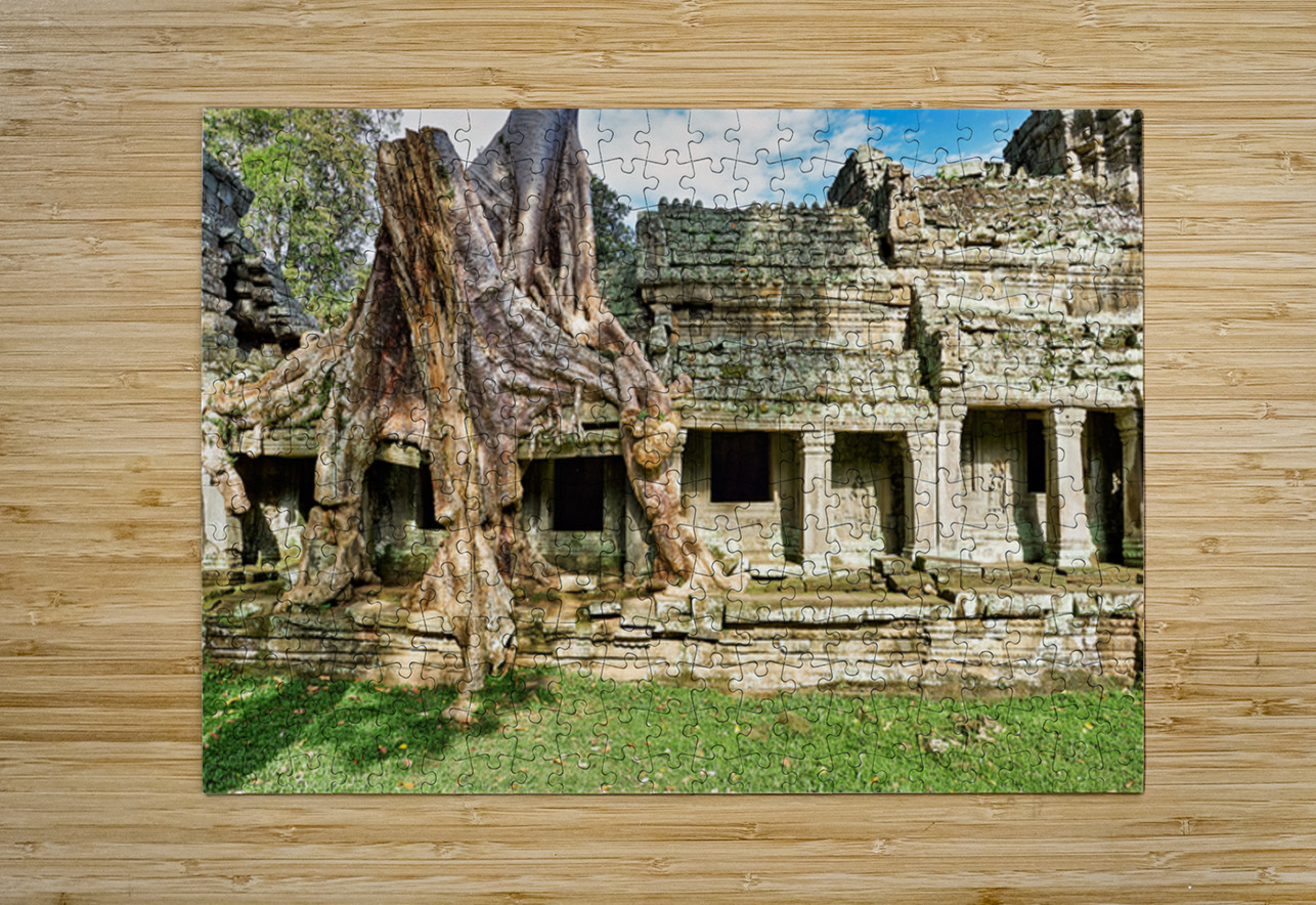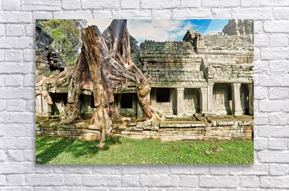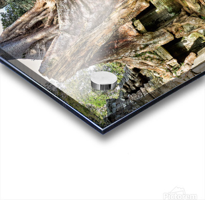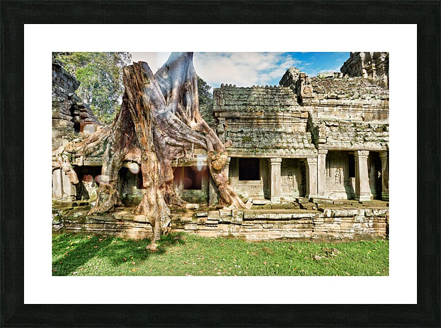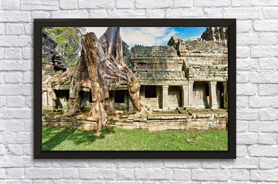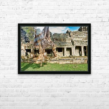 "Tree roots engulf ancient temple ruins." in a framed print.