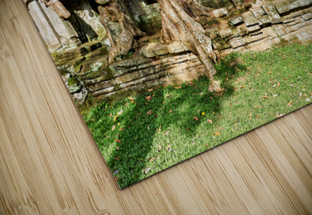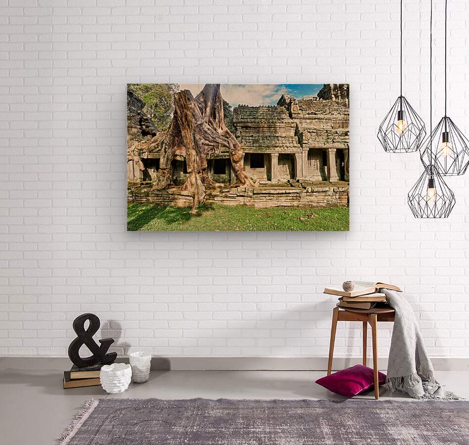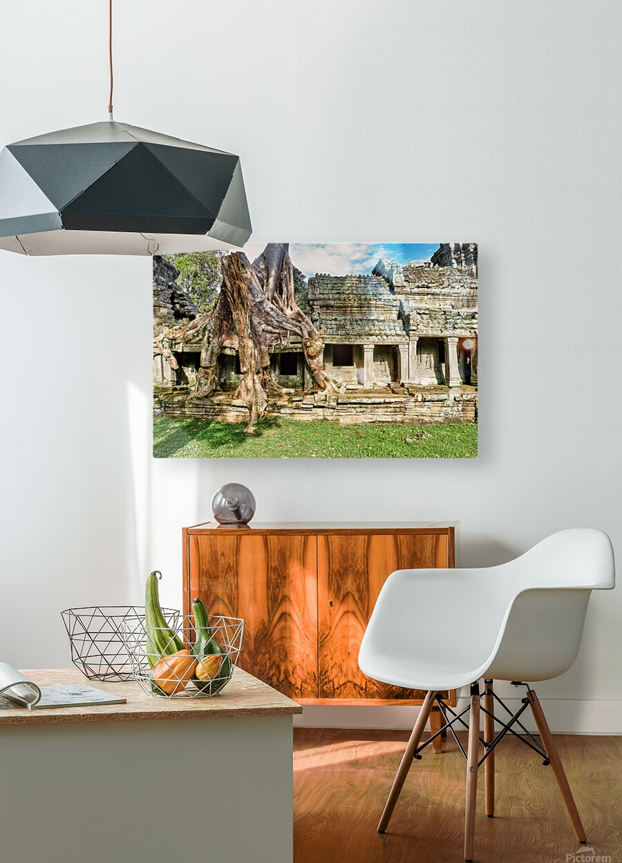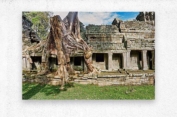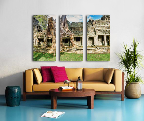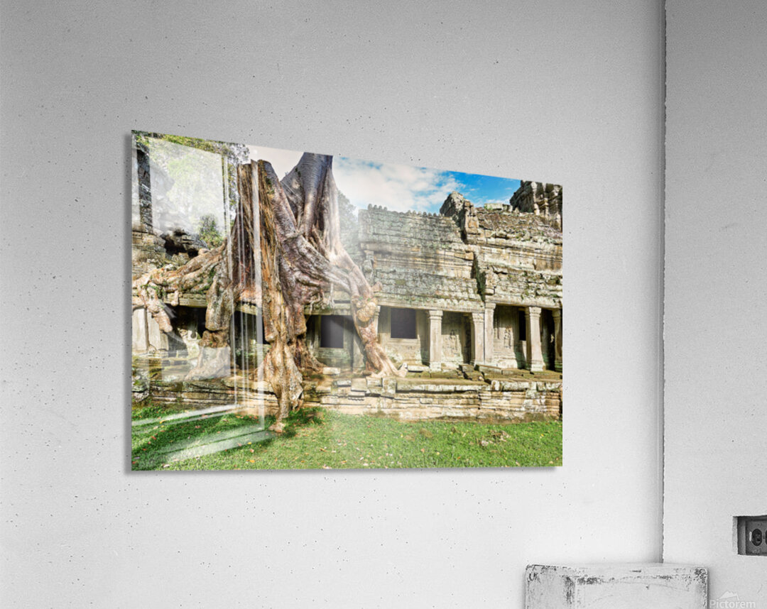 "Tree roots engulf ancient temple ruins." in a framed print.